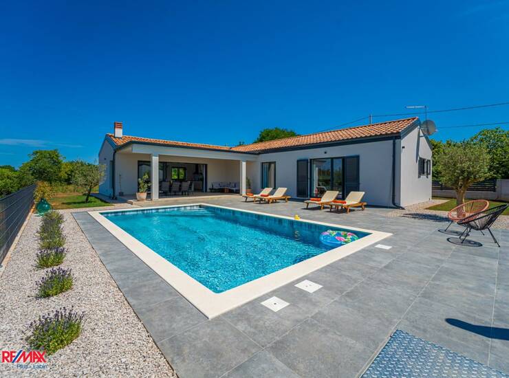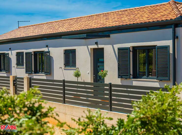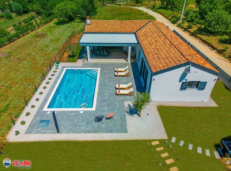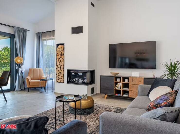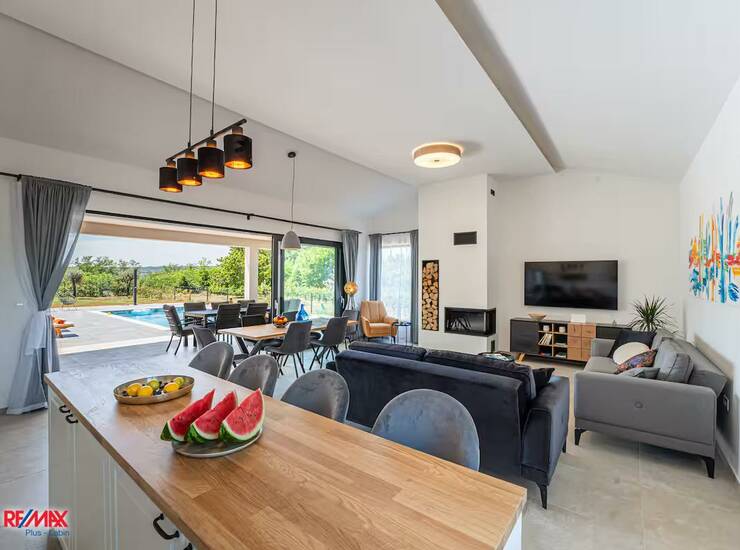 Na prodaju je moderno uređena prizemnica izgrađena 2023. godine, smještena na mirnoj lokaciji okruženoj prirodom, s predivnim pogledom na šumu i planinu Učku. Kuća ima 150 m² korisne površine i nalazi se na prostranoj, potpuno uređenoj okućnici od 845 m², koja pruža visoku razinu privatnosti i ugodnog boravka na otvorenom.