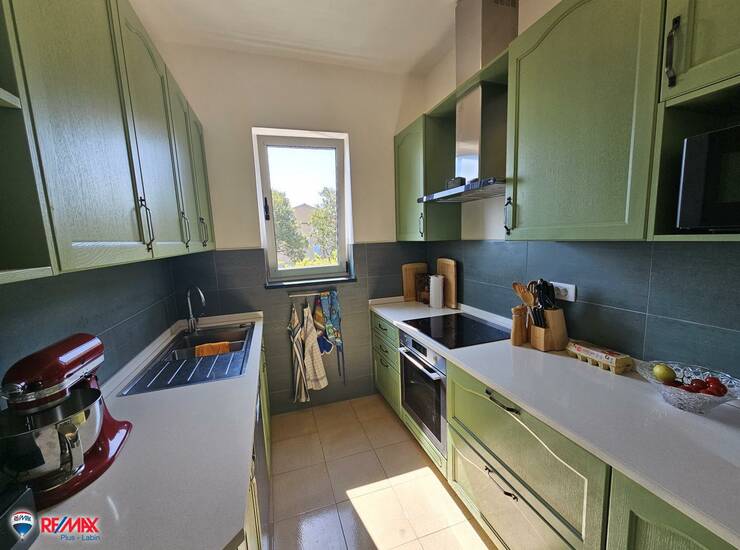 Na okućnici sa posađenim maslinama i vinovom lozom je izgrađen novi vanjski bazen sa natkrivenom ljetnom kuhinjom opremljenom dvostrukom rashladnom vitrinom za hlađenje pića i roštiljem. Pored ljetne kuhinje, imamo i zimsku kuhinju površine 18m2 sa kompletnom kuhinjom i peći na drva.