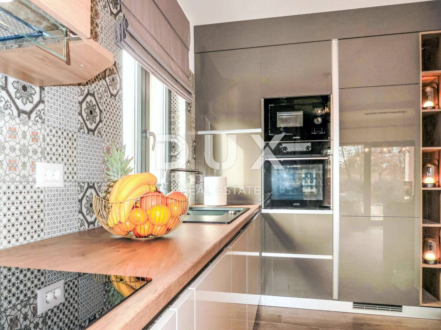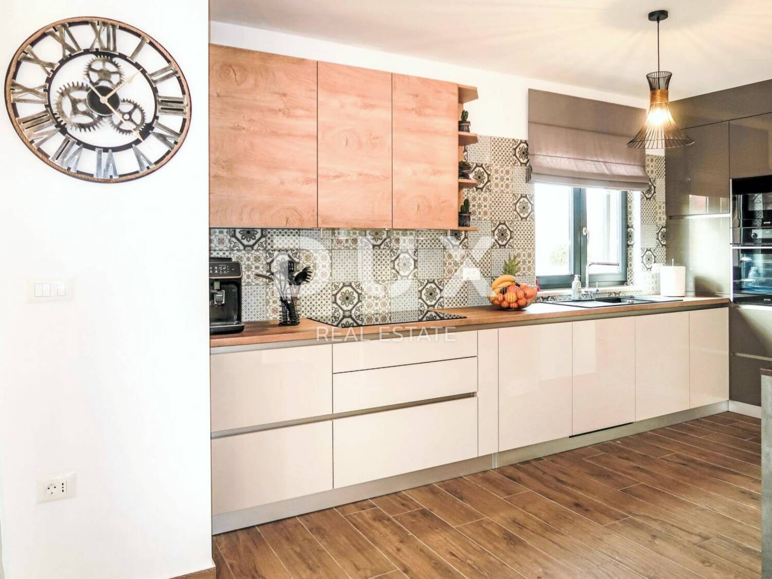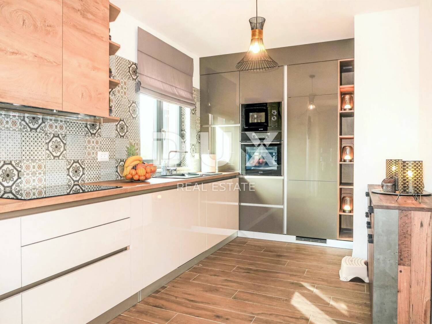 Novoizgrađena kuća je koncipirana kao jedna stambena jedinica koja se proteže na dvije etaže prozračnog, okupanog prirodnom svjetlošću interijera koji odiše elegancijom.