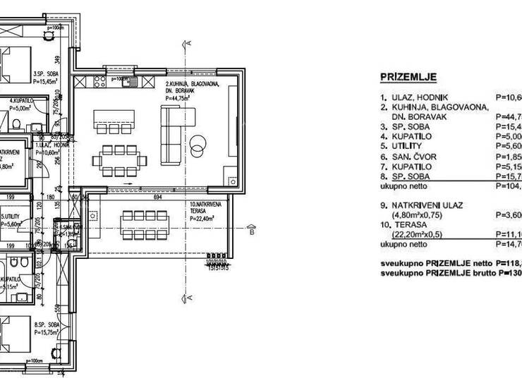 Dnevni dio se sastoji od kuhinje, blagovaonice i dnevnog boravka s izlazom na natkrivenu terasu koja sadrži ljetnu kuhinju dok se noćni dio sastoji od dvije spavaće sobe s vlastitim kupaonicama. Tlocrt nadopunjuju hodnik, gostinjski toalet i spremište.