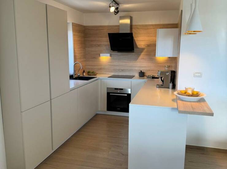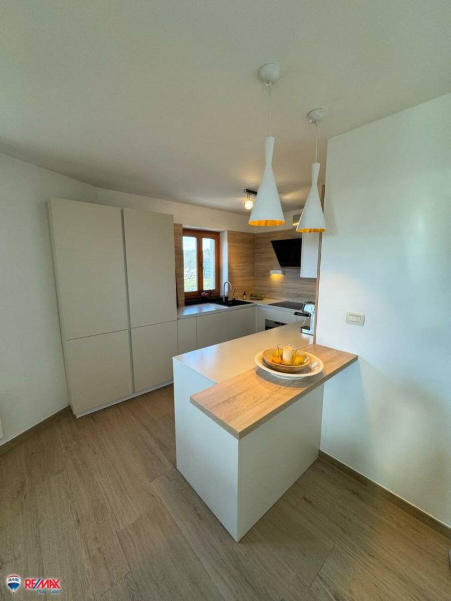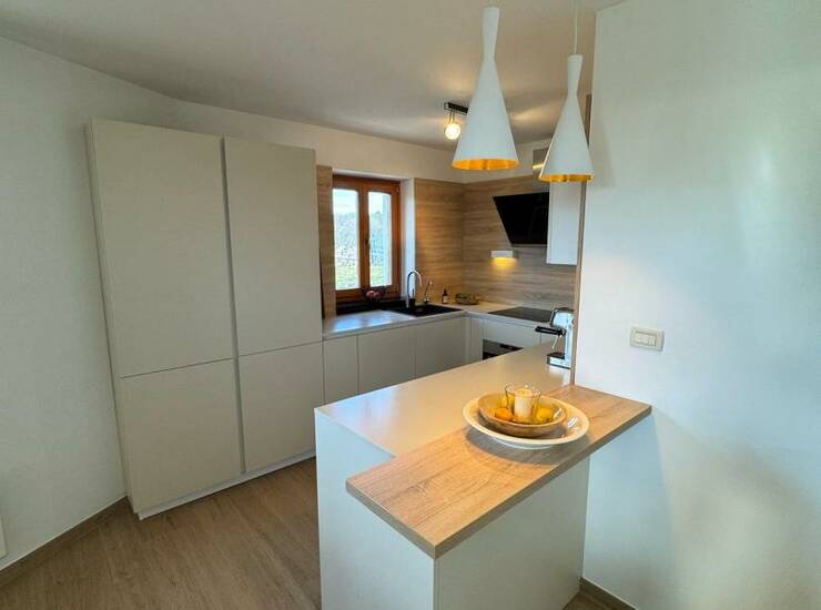 Prizemlje ima funkcionalan ulazni dio koji vodi do WC-a za goste i hladnog, prostranog podruma - idealno za skladišni prostor ili kao skladište vina. Otvorena kuhinja, dnevni boravak i blagovaonica čine srce kuće. Moderno opremljena kuhinja poziva vas da dočarate kulinarske kreacije, dok elegantni kamin osigurava ugodne sate. Svjetlost preplavljuje prostoriju kroz staklena klizna vrata od poda do stropa i stvara g