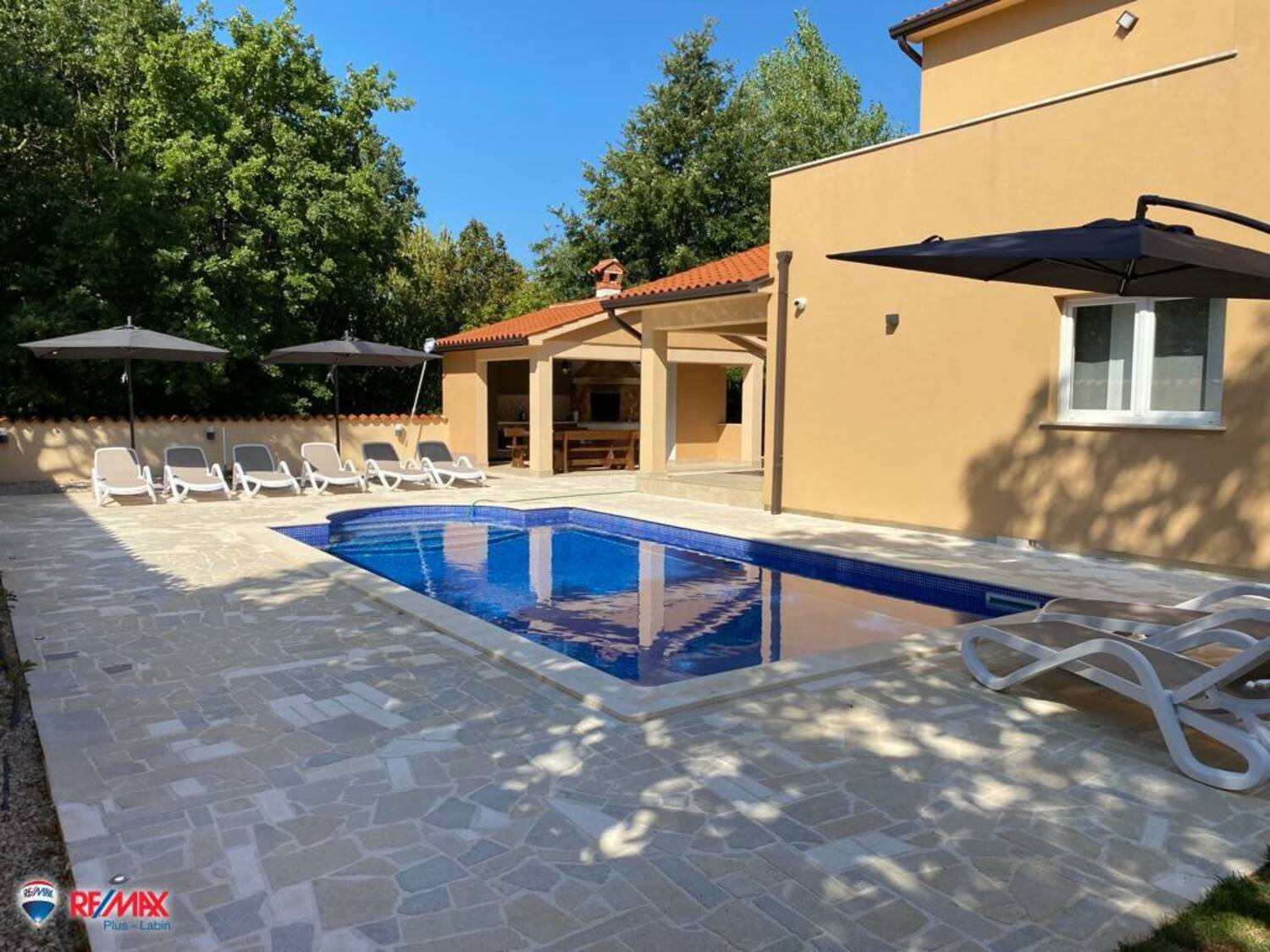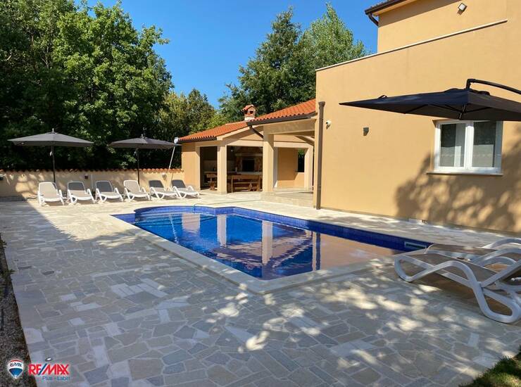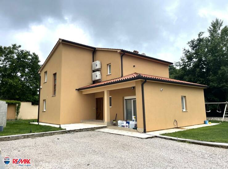 Na samo 5 minuta vožnje od Labina prodaje se moderno uređena katnica s bazenom, prostranom okućnicom i potpunom privatnošću, idealna za obiteljski život ili turističku investiciju. Kuća ima površinu od 151 m², a nalazi se na ograđenom i održavanom zemljištu veličine 845 m². Sastoji se od četiri spavaće sobe, dvije kupaonice te jednog vanjskog toaleta, a izgrađena je 2017. godine.