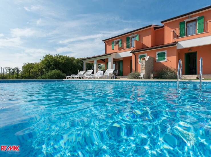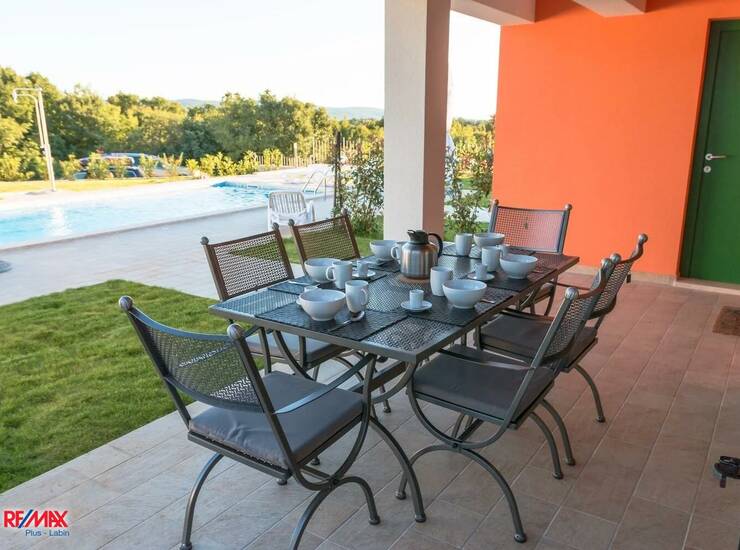 U mirnom i ugodnom okruženju u okolici Labina, s otvorenim panoramskim pogledom, smještena je ova lijepa vila izgrađena i uređena u autentičnom mediteranskom stilu.