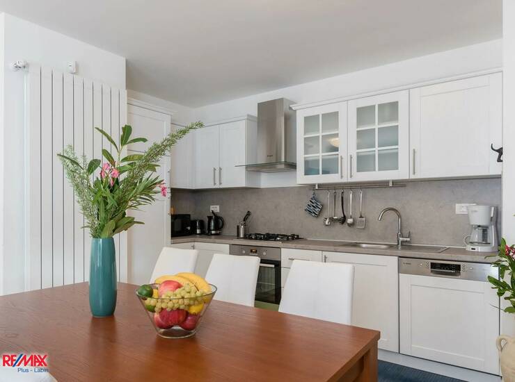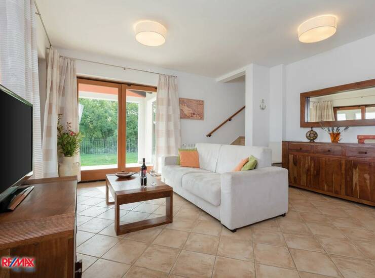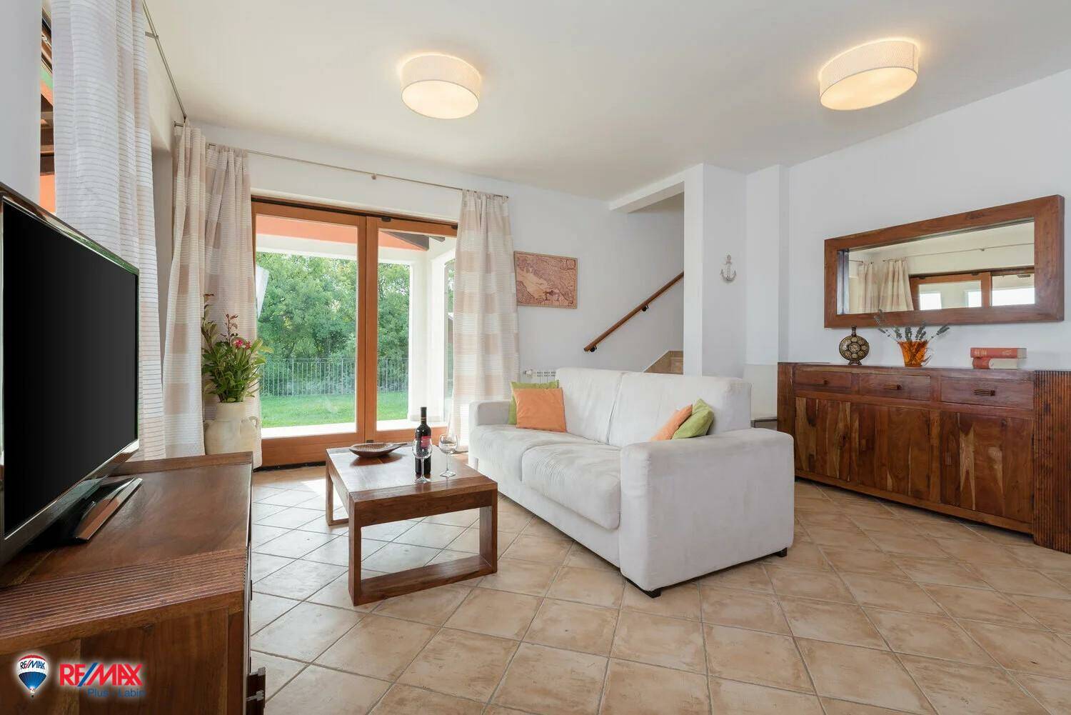 Vanjski prostor dodatno naglašava mediteranski ugođaj – ispred ulaza nalazi se natkrivena terasa s pogledom na bazen, sunčalište i uređeni travnjak. Na potpuno ograđenoj okućnici nalaze se i stabla maslina te roštilj zona, idealna za opuštanje i druženja na otvorenom.