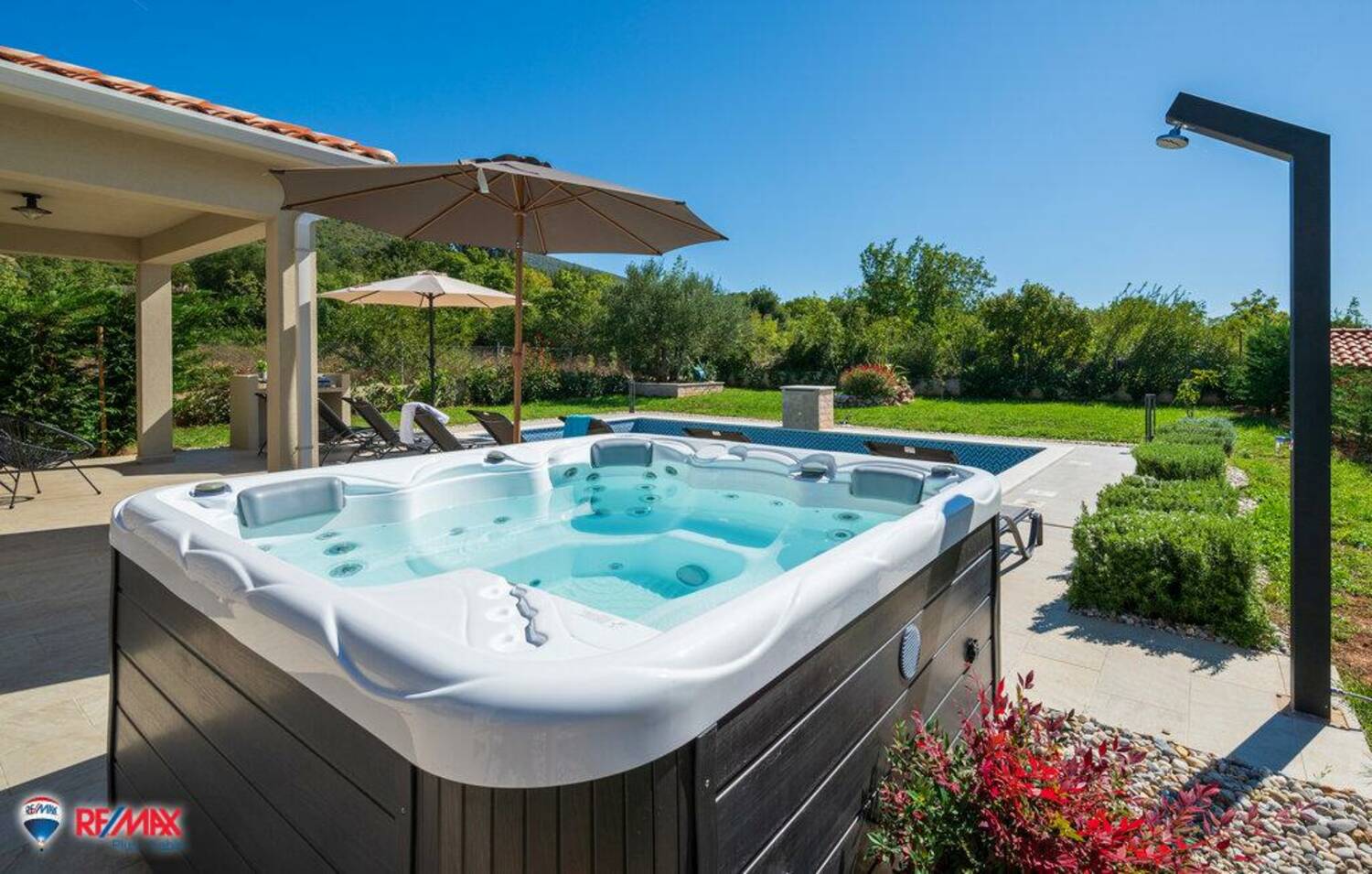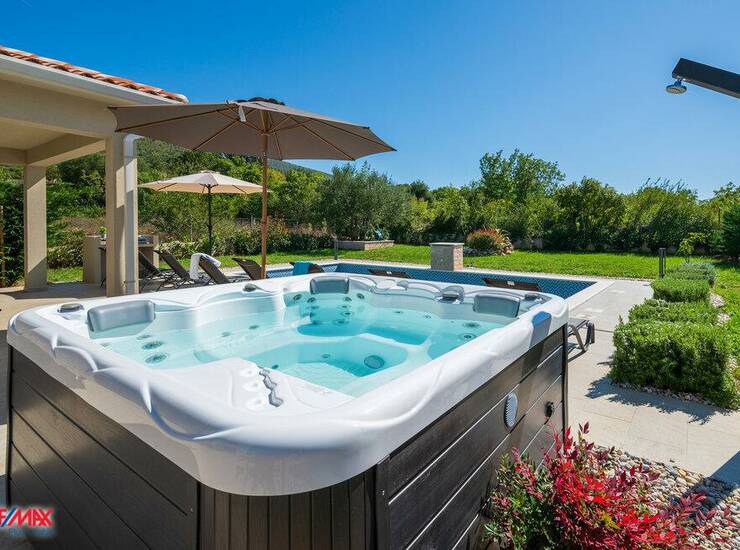 U uređenom dvorištu nalaze se bazen (32 m²), jacuzzi, vanjski tuš i roštilj zona, uz četiri parkirna mjesta.