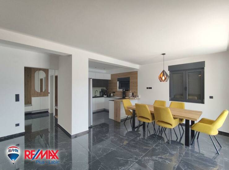 Na katu su smještene tri spavaće sobe, kupaona i terasa sa koje se pruža neometan pogled na stari grad Labin.