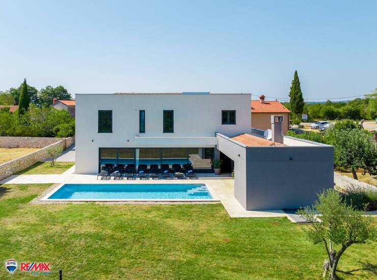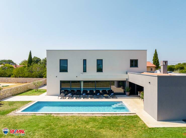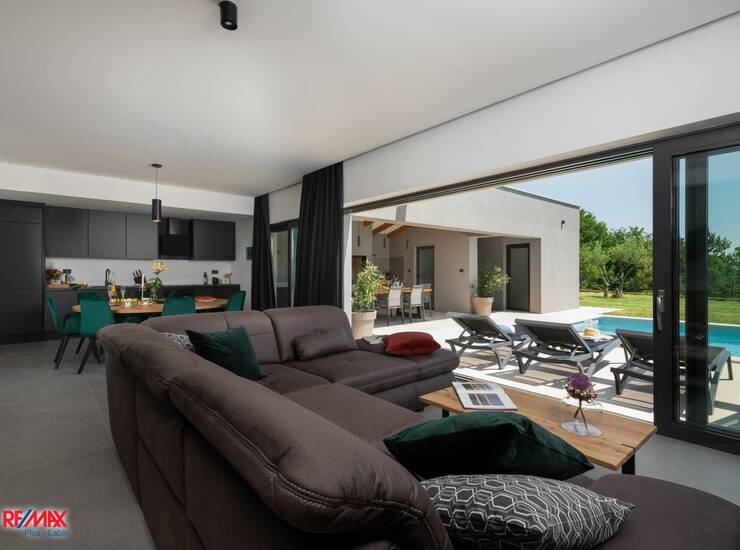 Velika staklena stijena dnevnog boravka otvara nam pogled na prekrasno uređenu okućnicu na kojoj je smještena natkrivena ljetna kuhinja i bazen sa sunčalištem površine 39 m2.