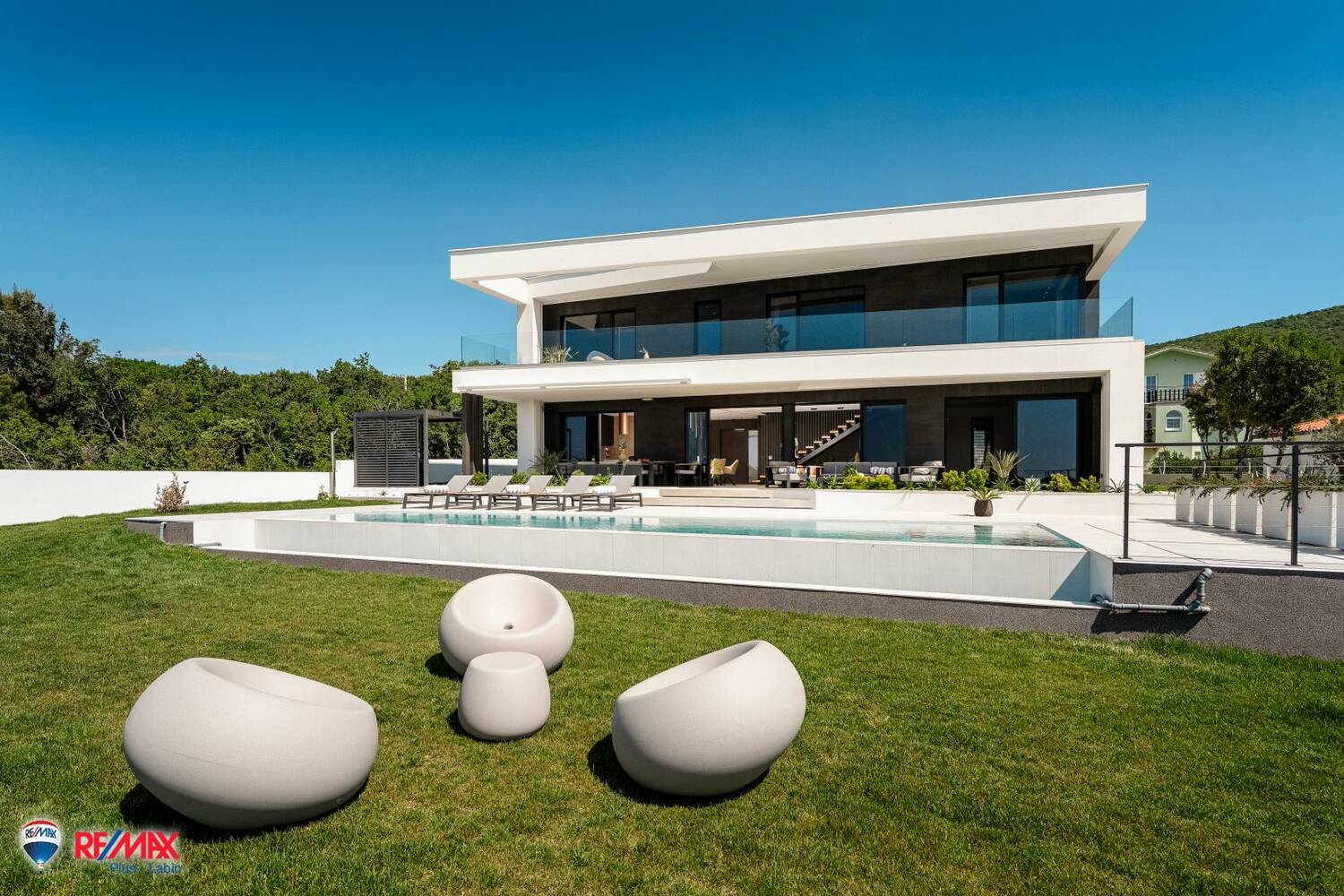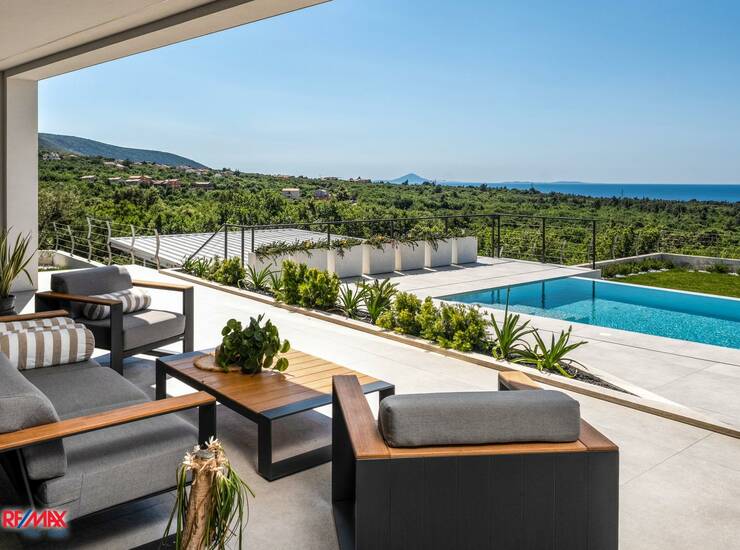 Vanjski prostor jednako je dojmljiv – grijani infinity bazen čini prirodnu poveznicu s horizontom, dok prostrana terasa, sunčalište, lounge zona i roštilj stvaraju savršen ambijent za boravak na otvorenom. Tu su i sadržaji poput privatne teretane s pogledom na more, dječjeg igrališta i sportskog prostora koji dodatno obogaćuju ponudu.