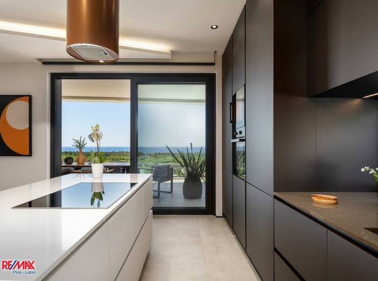 Prostran interijer od 240 m² odiše elegancijom i funkcionalnošću. Svaki detalj pažljivo je osmišljen – od prozračnog dnevnog boravka s panoramskim stijenama, preko dizajnerske kuhinje opremljene vrhunskim uređajima, do četiri luksuzne spavaće sobe s vlastitim kupaonicama. Glavna spavaća soba nudi dodatnu notu luksuza s kadom pozicioniranom tako da pruža pogled na more iz privatnosti vlastite sobe.