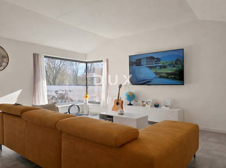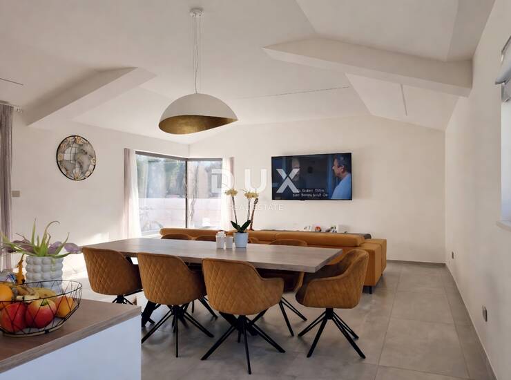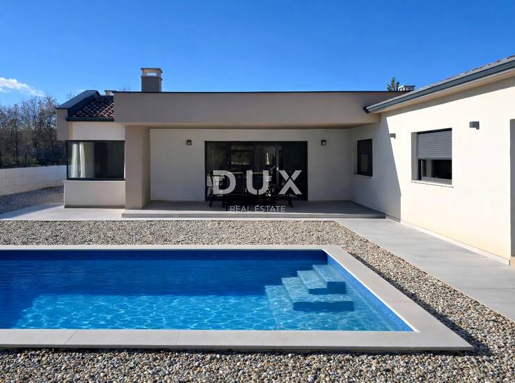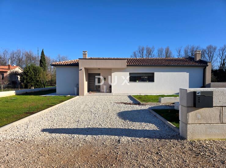 Kuća suvremenog iskoraka u bezvremenskoj arhitekturi s naglaskom na funkcionalnost i estetiku se oblikovno i koloristički uklopa u naselje i krajolik, razvedena je na jednu elegantno namještenu i kvalitetno opremljenu etažu funkcionalnog tlocrta a stambena površina nudi skladan životni ambijent okupan prirodnom svjetlošću koji odiše sofisticiranošću i udobnošću.