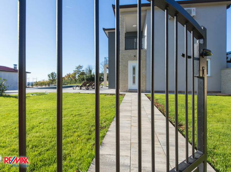 Velike staklene stijene dijele dnevni boravak sa prekrasnom natkrivenom terasom i bazenom kojeg okružuje prostrana plaža i vrt.