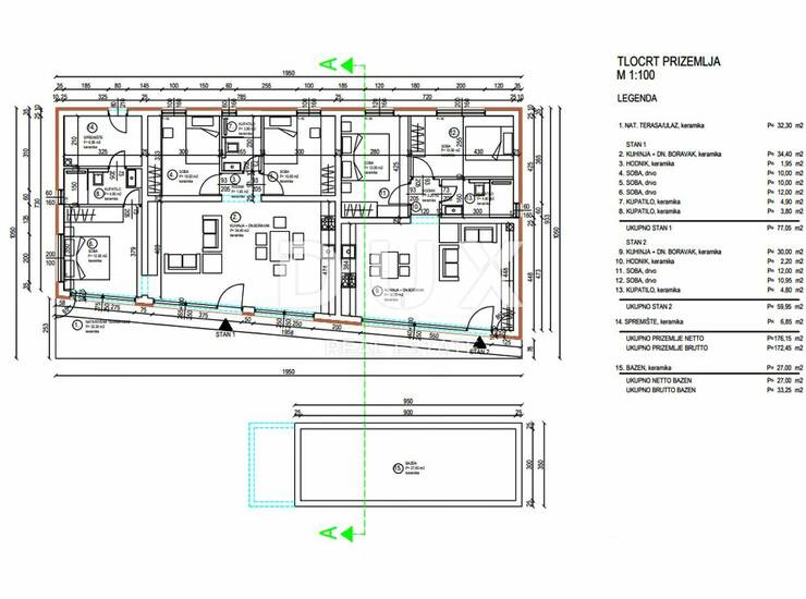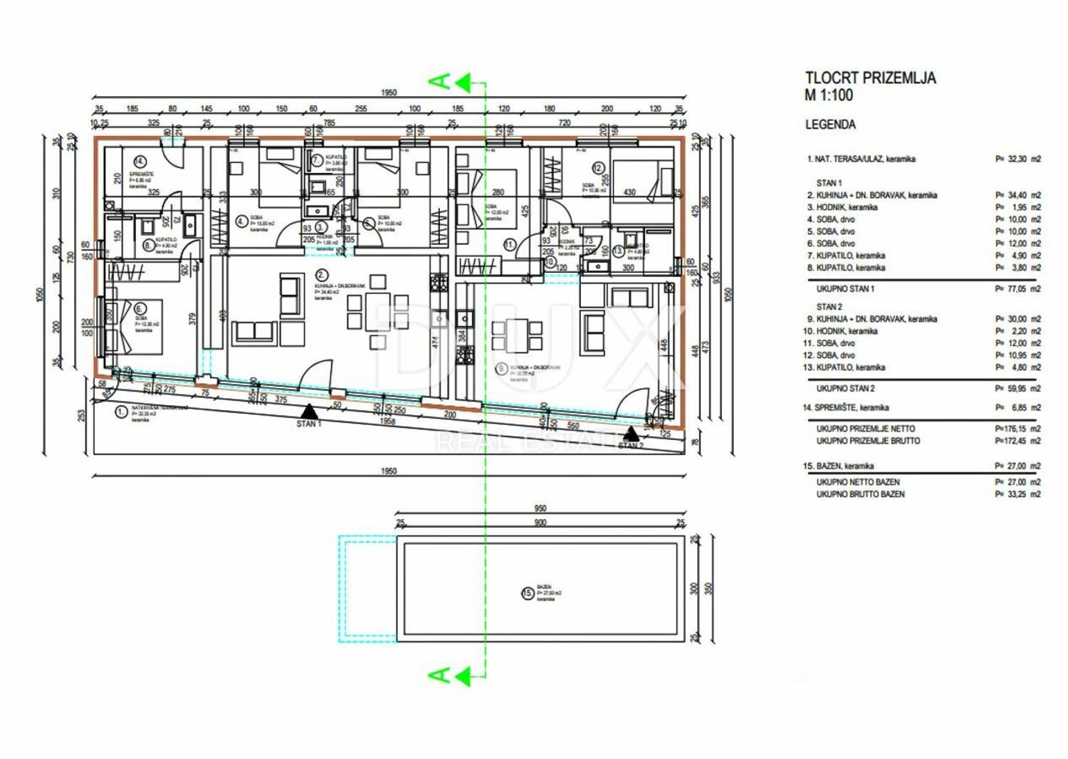 Kuću odlikuje kvalitetna gradnja i suvremen, moderan dizajn. Stambena površina jasno je definirana i maksimalno iskorištena te sadrži drži dvije stambene jedinice.