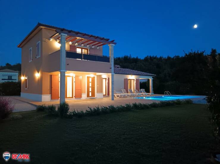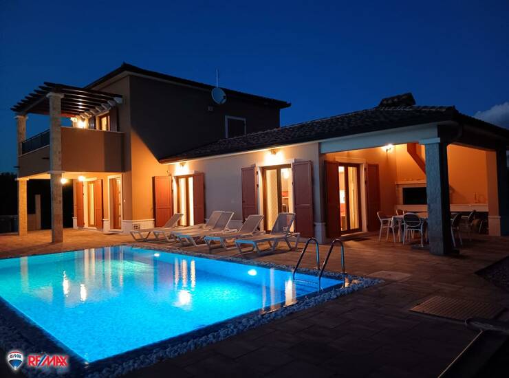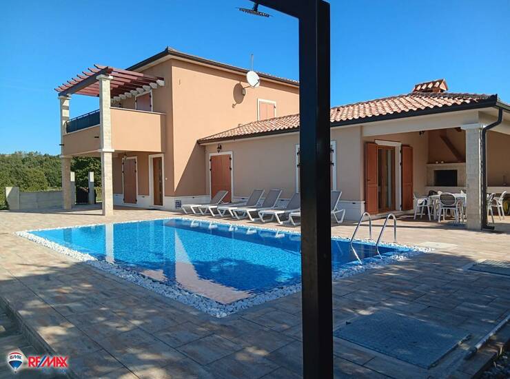 Ispred kuće proteže se vanjski bazen, do bazena je dječje igralište i terasa sa ljetnom kuhinjom gdje je izveden kamin za rošiljanje i stol za uživanje na otvorenom.