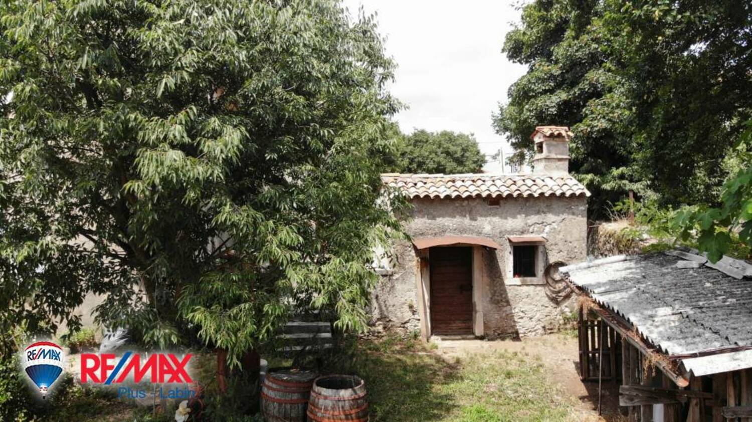 S druge strane kuće se nalazi zasebna garaža, zasebna kamena kućica s ognjištem i velika cisterna.