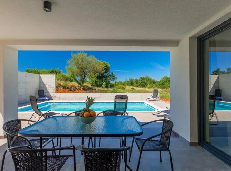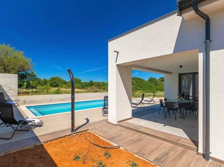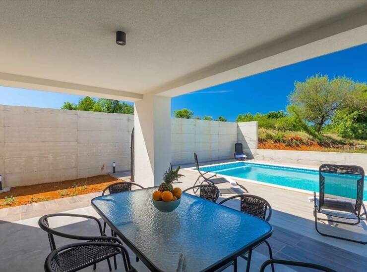 Novoizgrađena prizemnica sastoji se od tri spavaće sobe s vlastitim kupaonama, toaleta i prostranog dnevnog boravka i blagovaonice s potpuno opremljenom kuhinjom. Dnevni prostor s kaminom svijetao je i prozračan zahvaljujući velikim staklenim površinama te ima izravan pristup natkrivenoj terasi.