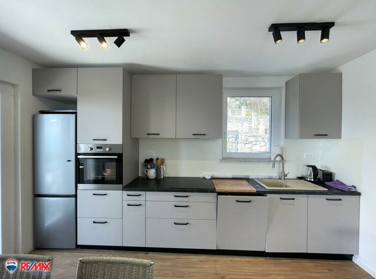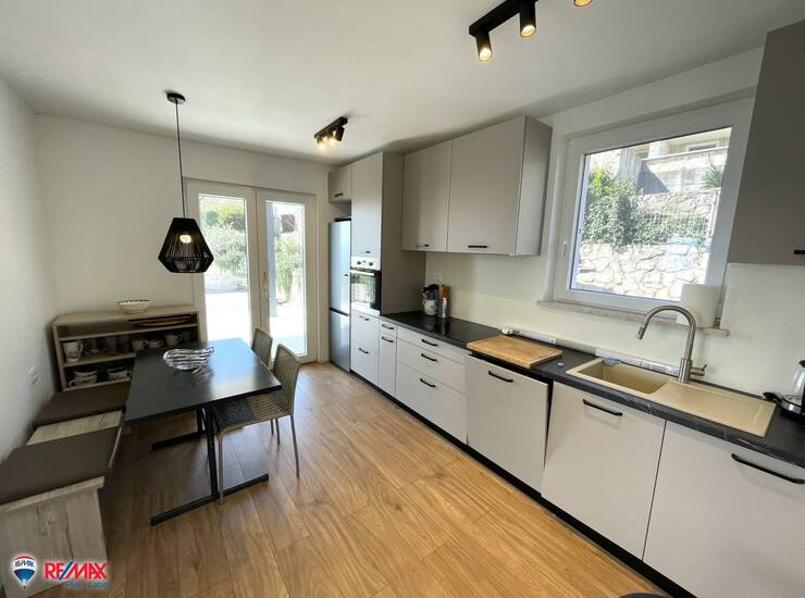 Prizemlje neto površine 66,25 m² uključuje kuhinju s blagovaonicom, dnevni boravak s izlazom na terasu, spavaću sobu, kupaonicu i ostavu. Grijanje je centralno putem peći na drva koja se nalazi u dnevnom boravku. Stan na katu ima 61 m², a sastoji se od kuhinje s blagovaonicom i dnevnim boravkom, jedne spavaće sobe, kupaonice i ostave. Na katu se nalazi klima uređaj koji osigurava ugodan boravak tijekom cijele godine.