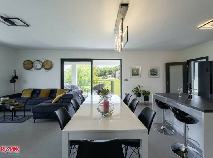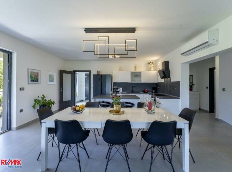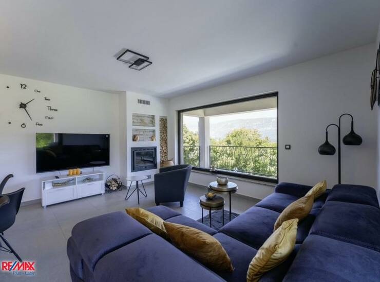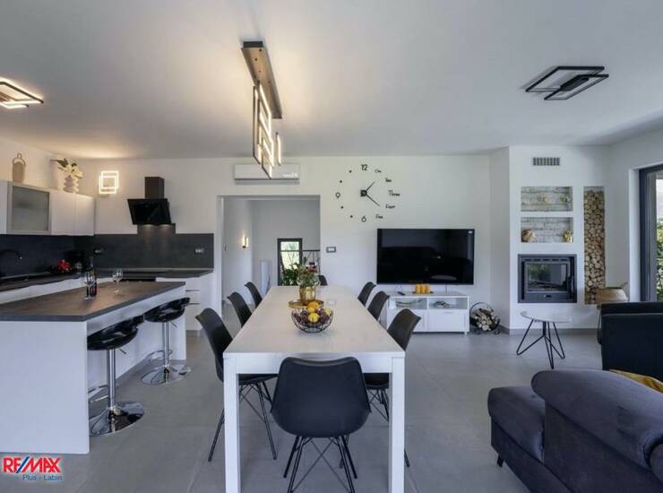 Prizemlje se sastoji od prostranog dnevnog boravka s kaminom, kuhinje s blagovaonicom, dvije spavaće sobe, dvije kupaonice i velike natkrivene terase s prekrasnim panoramskim pogledom na Učku.