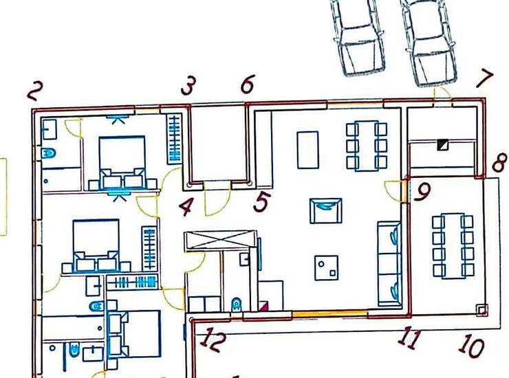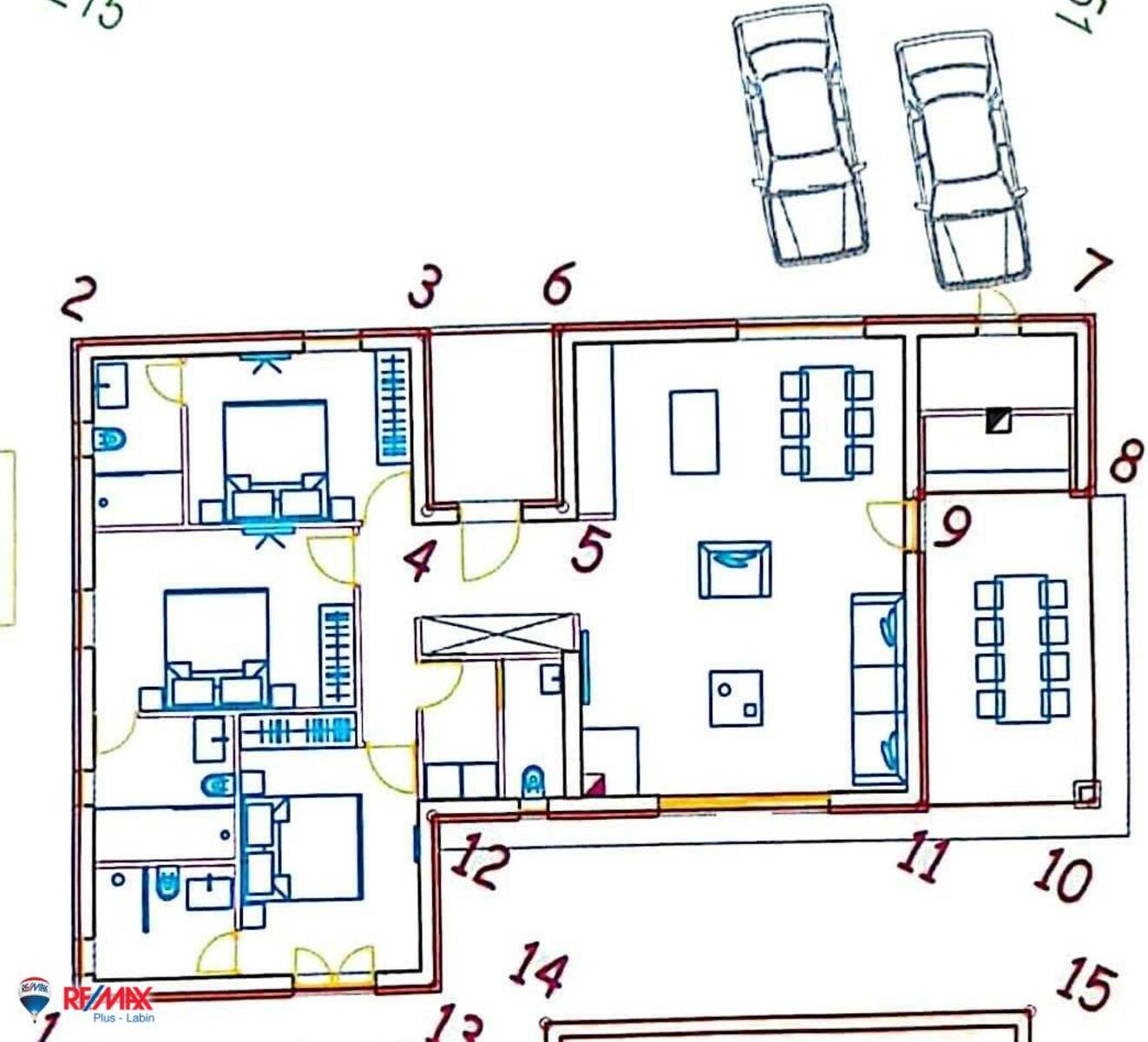 Kuća je površine 170 m2 a sastoji se od ''open space'' kuhinje s blagovaonom i dnevnim boravkom, malena ostava, tri spavaće sobe, tri kupaone i utilitya.