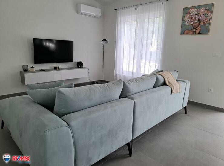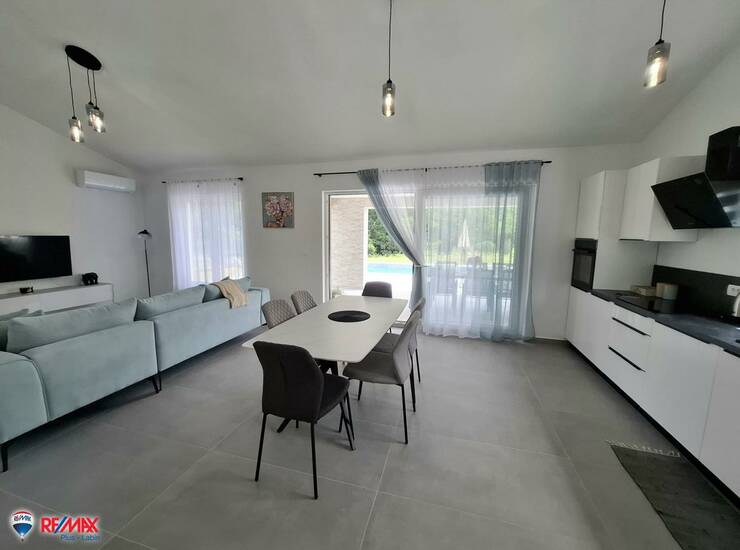 Iz dnevnog boravka je izlaz na natkrivenu terasu gdje je smješten grill i ljetna kuhinja te bazen.