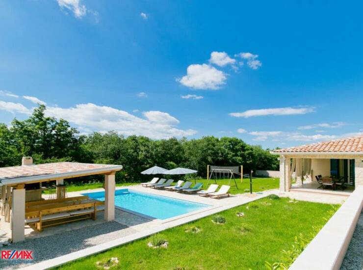 Okućnica je uređena i ograđena a kuća je orijentirana prema poljoprivrednoj zoni što pruža potpunu privatnost. Okućnicu krasi bazen površine 44 m2, natkrivena terasa s kaminom a za bolje održavanje okoliša postavljeno je navodnjavanje.