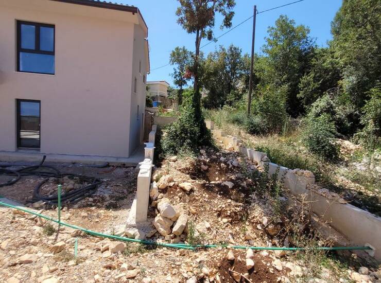 Pogled na more pruža se i sa prizemlja, a posebno ka prve etaže kuće. Pripadajuće zemljište površine je 800 m2. Izgrađen je vanjski preljevni bazen dimenzija 12,00 x 3,00 metra, predviđen za slanu vodu i sa dogrijavanjem, te pripadajuće sunčalište oko bazena je prostrano i otvara se pogledom prema Kvarnerskom zaljevu.