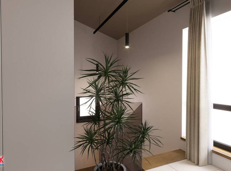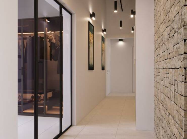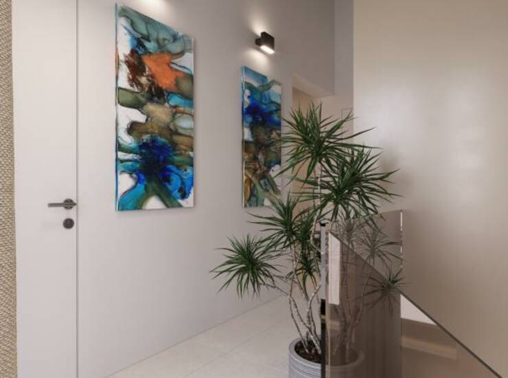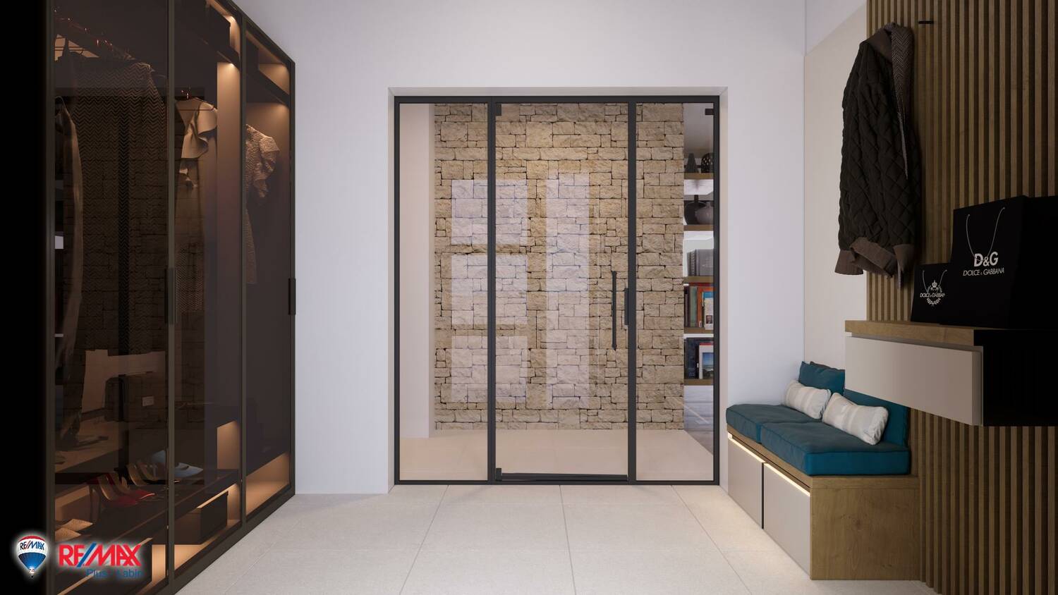 Unutarnje stepenice vode na 1.kat gdje se nalaze 4 spavaće sobe od kojih svaka ima privatno kupatilo, zatim relax kutak uz staklenu stijenu sa pogledom na more, i praonu ili utility.
