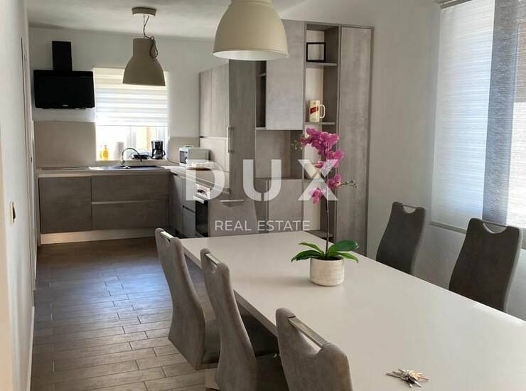 Prodaje se moderno uređena samostojeća katnica ukupne površine 151 m², smještena na svega nekoliko minuta vožnje od centra grada. U prizemlju se nalazi prostrani dnevni boravak povezan s kuhinjom i blagovaonicom, jedna spavaća soba, kupaonica te dodatna prostorija koja se, prema željama budućeg vlasnika, može koristiti kao prostor za druženje, kućnu teretanu, radnu sobu ili slično. Na katu su smještene tri spavaće sobe te još jedna kupaonica. Iz dnevnog boravka izlazi se na natkrivenu terasu. Ovdje se nalazi i potpuno opremljena ljetna kuhinja sa štednjakom, perilicom i hladnjakom, kao i vanjski toalet.