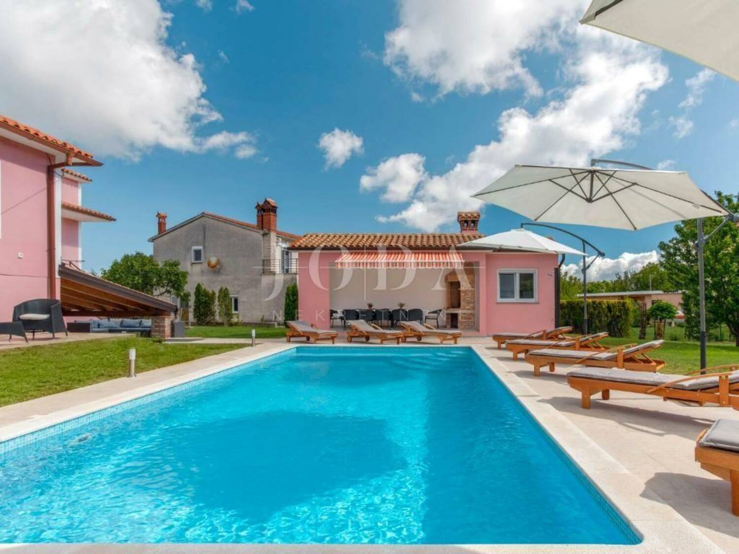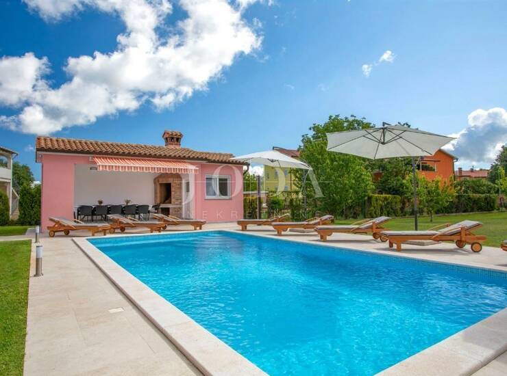 Na velikoj uređenoj okućnici nalazi se bazen sa sunčalištem, ljetna kuhinja i dječje igralište.