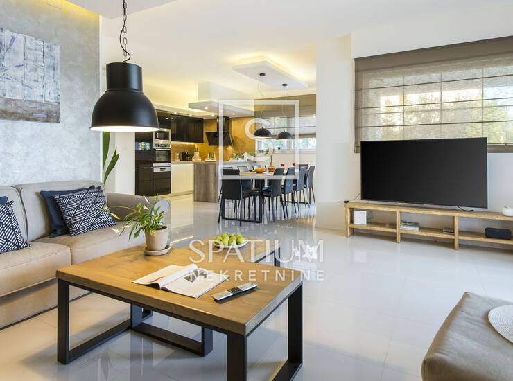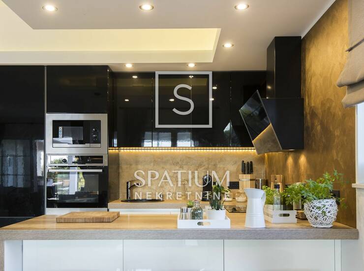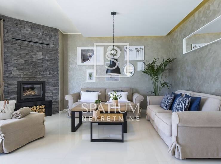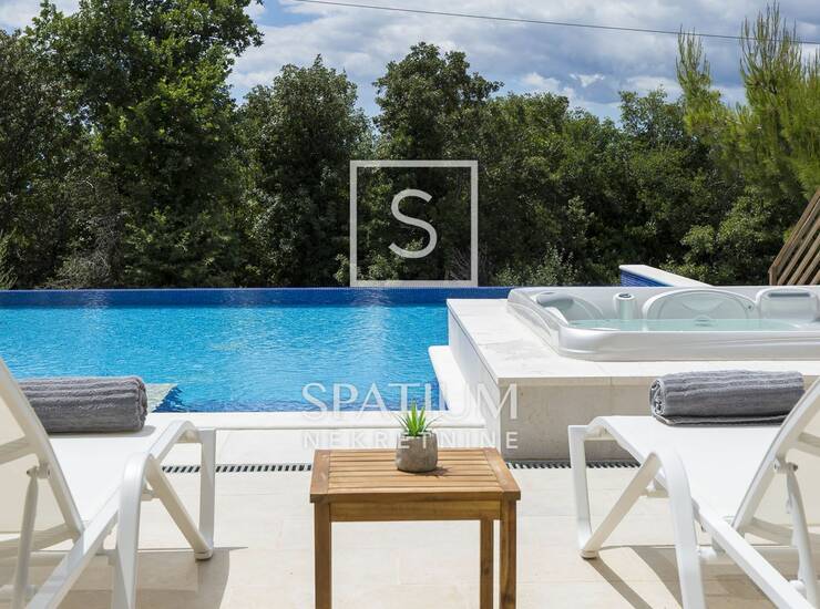 LABIN, OKOLICA, u ponudi imamo luksuznu vilu površine 240 m² smještenu na prostranom zemljištu od 920 m², savršeno opremljenu za udoban boravak tijekom cijele godine. Vila raspolaže s četiri elegantne spavaće sobe s vlastitim kupaonicama, dok dodatni ležajevi u dnevnom boravku nude dodatnu fleksibilnost. Sve sobe su klimatizirane, s ručno izrađenim bračnim krevetima, SMART TV-om i en suite kupaonicama s walk-in tuševima. Prostrani dnevni boravak s kaminom, podnim grijanjem i modernim interijerom spojen je s potpuno opremljenom kuhinjom i blagovaonicom, a iz njega se izlazi na veliku terasu s infinity bazenom (58 m²), masažnim slapom, pličakom za djecu, sunčalištem i jacuzzijem za šest osoba. Wellness zona uključuje saunu, tuš, toalet i grijani Laconium s glazbom za potpuni osjećaj opuštanja. Uz mediteranski vrt i vanjsku kuhinju s roštiljem i natkrivenim blagovaonskim prostorom, vila pruža potpunu privatnost i komfor, uz brojne dodatke poput dječjeg igrališta, fitnessa i tri parkirna mjesta.