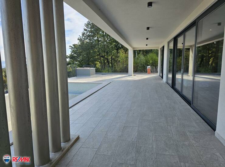Iz dnevnog boravka i spavaćih soba izlazi se na prostranu vanjsku terasu gdje se smjestio vanjski infinity bazen površine 48 m2 (12x4 metara).Sa terase se pruža pogled na more.