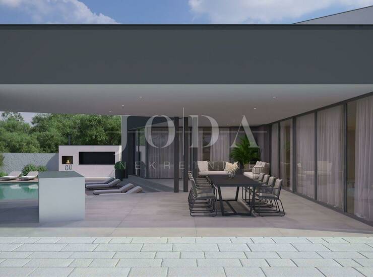 U okolici Labina na prodaju je luksuzna kuća u izgradnji brutto površine cca 500m2.U sklopu prizemlja planirana je open space kuhinja sa blagavaonom, prostranim dnevnim boravkom, jedna spavaća soba sa kupaonom, fitness prostorija sa saunom i vešeraj. Na prvom katu kuće nalazi se još tri spavaće sobe sa kupaonom, svaka soba pruža izlaz na terasu sa prekrasnim pogledom na okolno zelenilo.Nudi se mogućnost uređenja interijera prema vlastitim željama. U kući je postavljeno podno grijanje, u prizemlju u cijeloj površini, na katu u kupaonama, a sobe će se grijati preko klima uređaja (ugrađene u strop) preko dvije dizalice toplane plus dodatna za vanjski bazen od 80m2. Kuća nudi mogučnost maksimalnog uživanja i opuštanja,