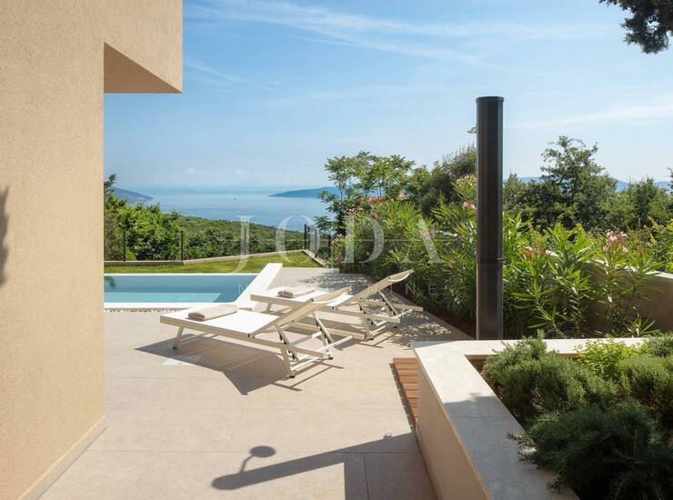 Ova predivna luksuzna vila smještena je na parceli od 660 m2 u malom mjestu nedaleko Labina. Okružena je zelenilom koje se pruža sve do mora. Vila je površine 200m2 stambenog prostora te je potpuno opremljena dizajnerskim namještajem s naglaskom na detalje i luksuz. Nalazi se na idealnoj poziciji s prekrasnim neometanim pogledom na more, Kvarner, otoke Cres i Lošinj te Rijeku.