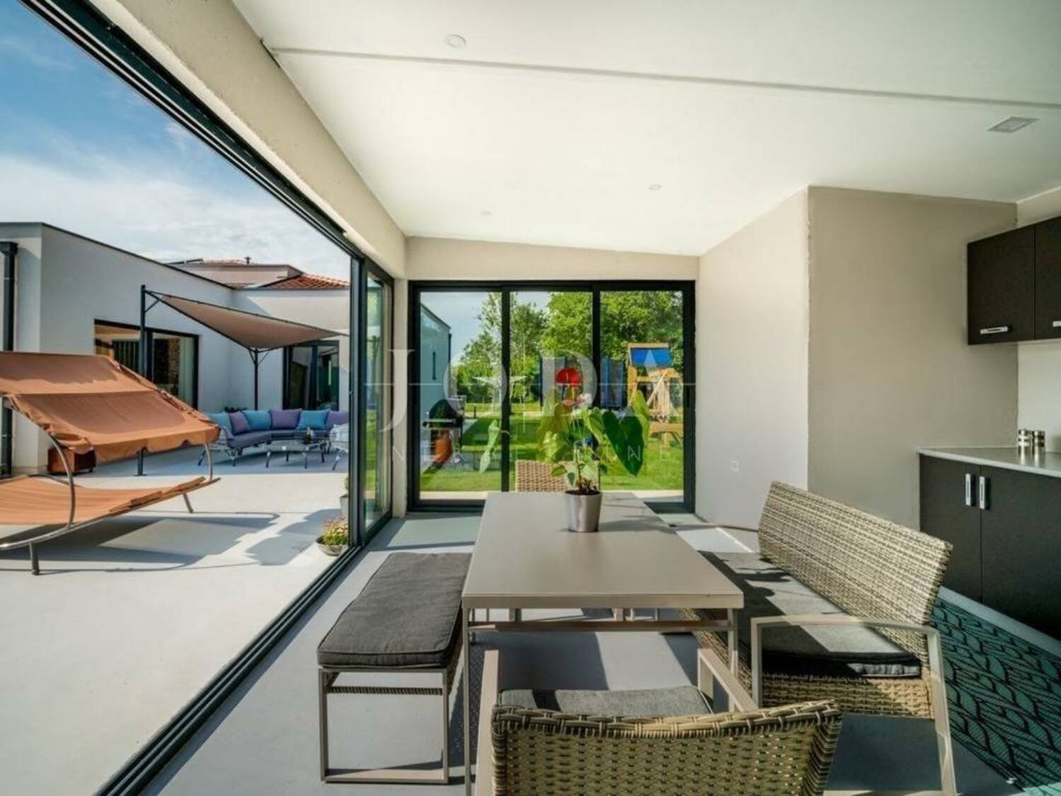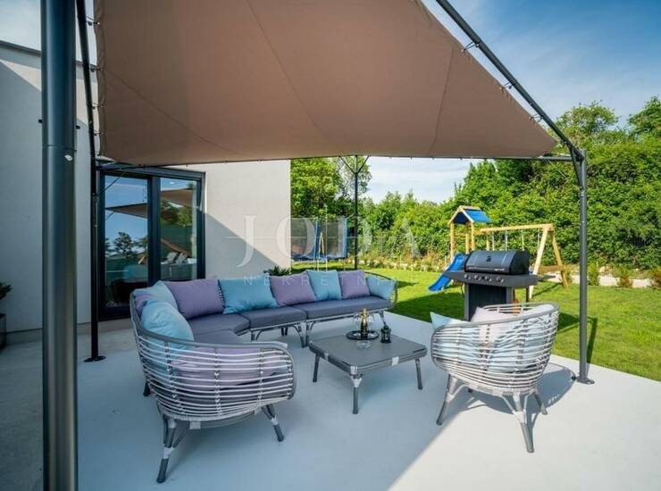 Na uređenoj i održavanoj okućnici nalazi se grijani bazen sa slanom vodom, sunčalište, zatvorena ljetna kuhinja, dječje igralište, te natkrivena terasa sa sjedećom garniturom za uživanje u toplim ljetnim mjesecima.
