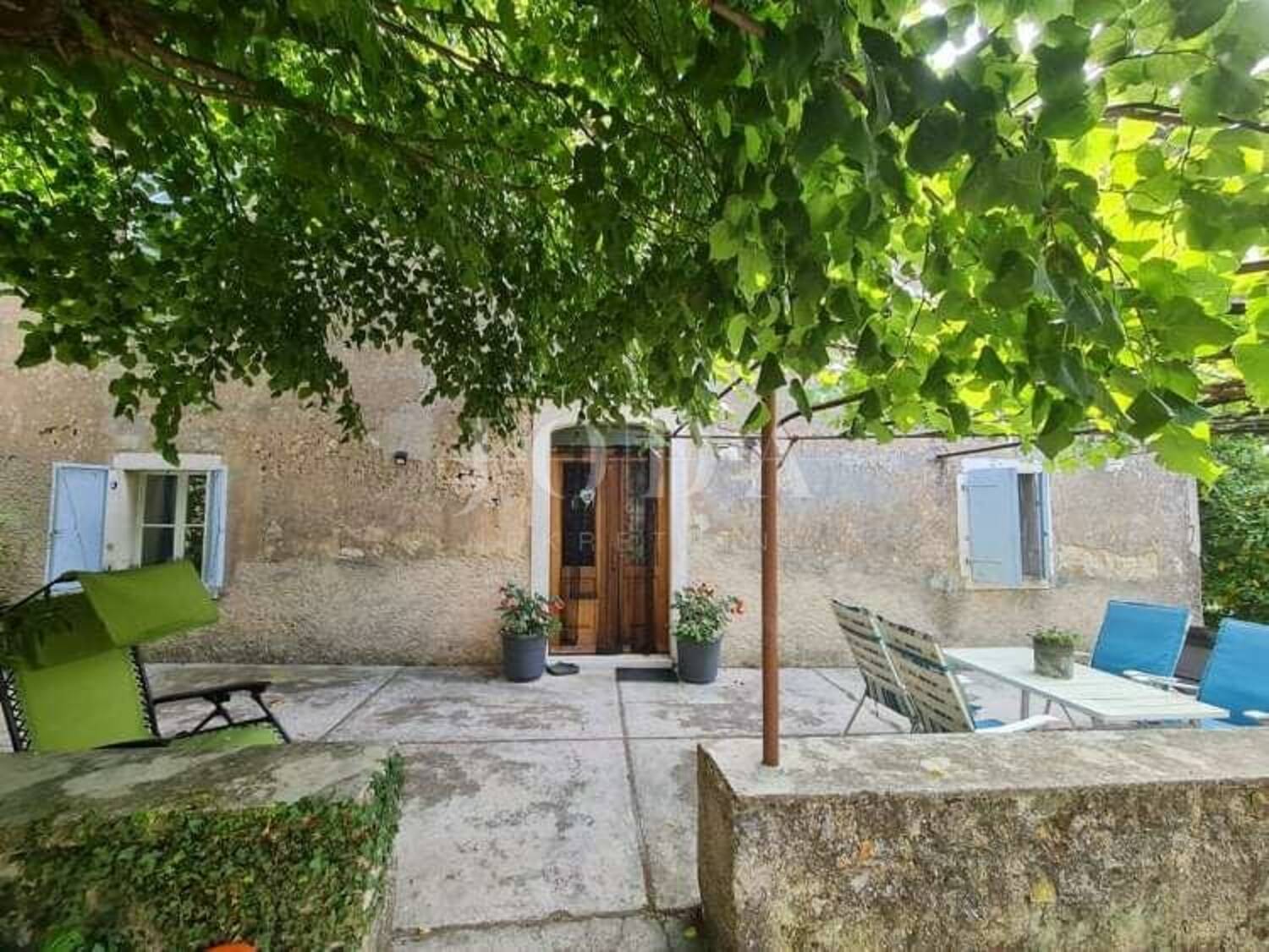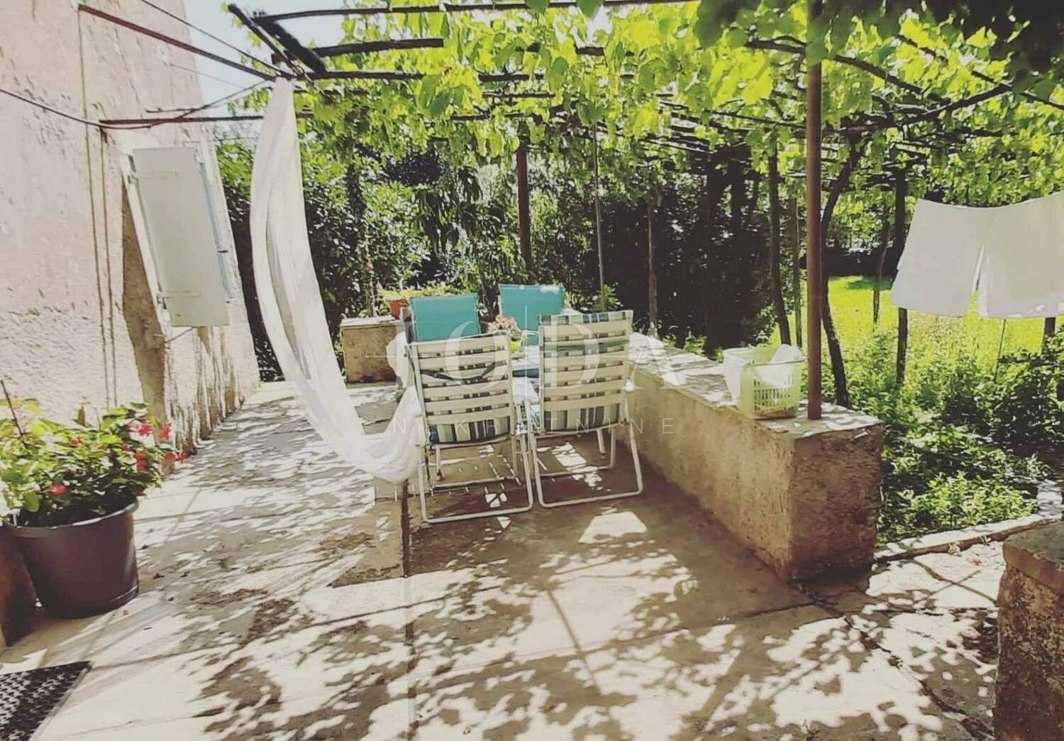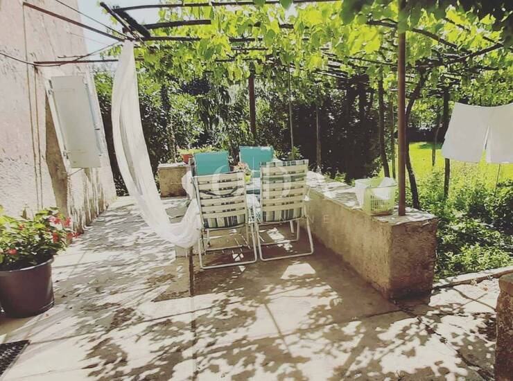 Prostrana vanjska kamena terasa ograđena je kamenim zidom i stoljetnim listopadnim stablima i pergolom od vinove loze.