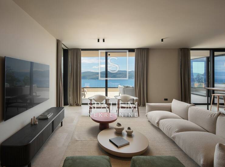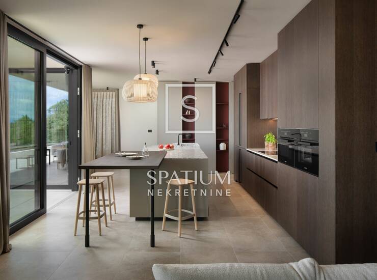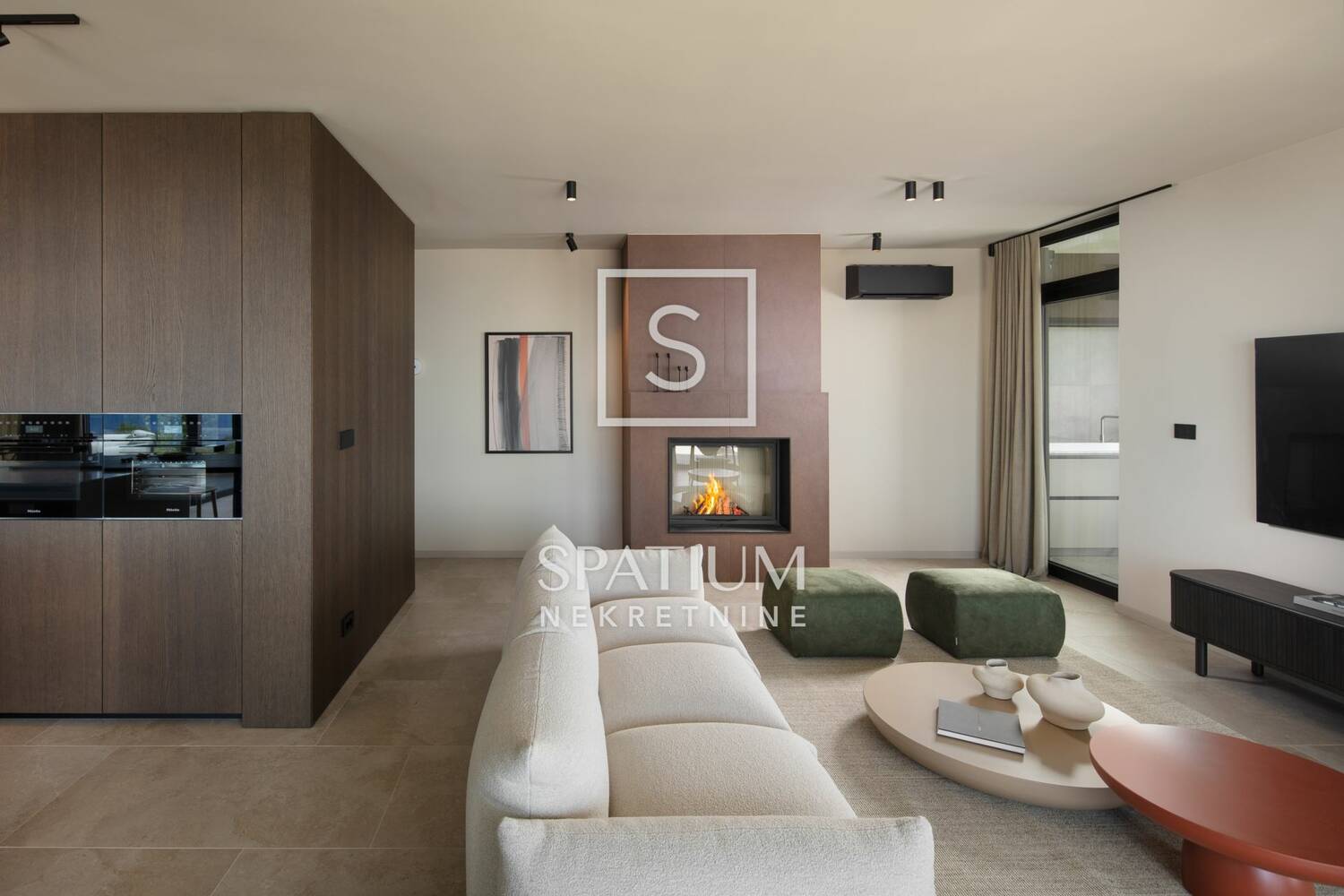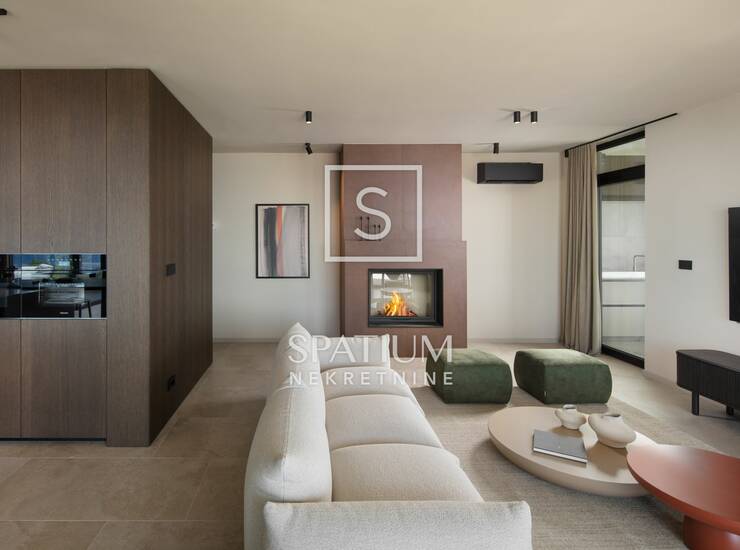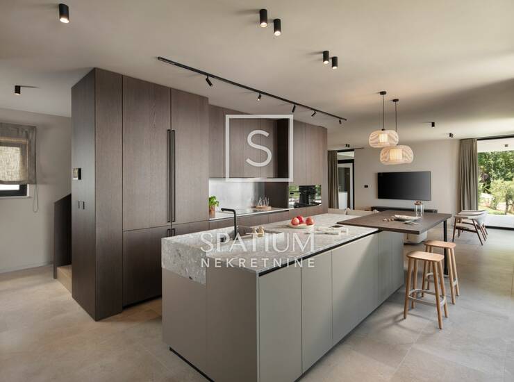 Donja etaža osmišljena je kao reprezentativan dnevni prostor otvorenog koncepta. Prostrani dnevni boravak s kaminom, blagovaonica i moderno opremljena kuhinja s kuhinjskim otokom čine elegantnu cjelinu, idealnu za svakodnevni život i druženja. Velike staklene površine osiguravaju obilje prirodnog svjetla te omogućuju direktan izlaz na terasu i bazen, uz neometan pogled na more i prirodno okruženje. Na istoj etaži nalazi se i luksuzni wellness prostor sa saunom, jacuzzijem i tušem, dodatno naglašavajući ekskluzivan karakter nekretnine.
