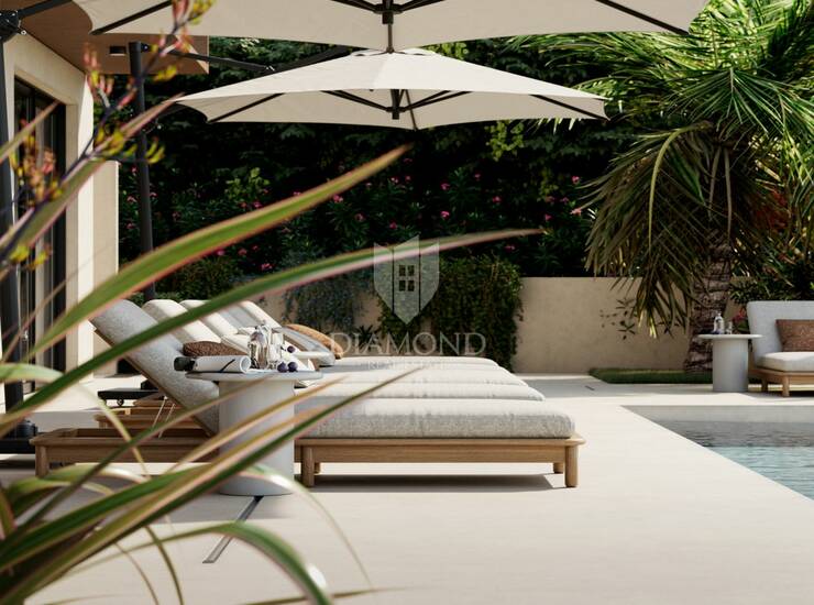 Uređena okućnica površine 622 m² okružuje vilu i osigurava potpunu privatnost. U središtu eksterijera nalazi se privatni infinity bazen površine 38 m² sa sunčalištem, idealan za opuštanje i uživanje u mediteranskom načinu života. Okućnica je hortikulturno uređena mediteranskim biljem te opremljena automatskim sustavom navodnjava