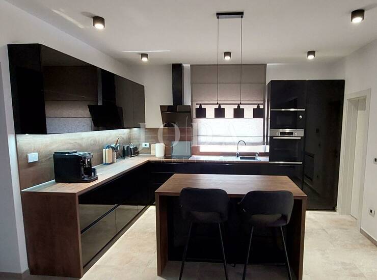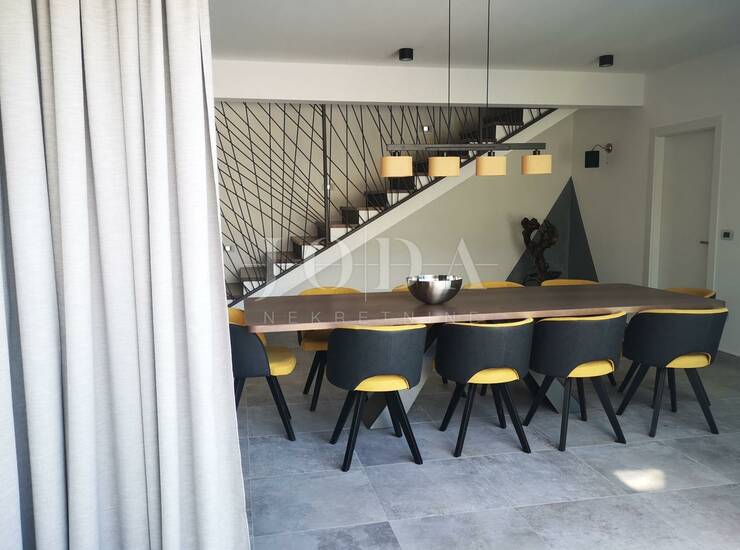 U prostranom prizemlju okruženim velikim staklenim stijenama koje unose svijetlost u čitav prostor nalazi se moderno opremljena kuhinja,velika blagovaona i dnevni boravak. Sve prostorije vode na uređenu terasu sa bazenom koji pruža mogučnost uživanja tokom čitave godine (bazen ima toplinsku pumpu za grijanje). U produžetku prizemlja nalazi se jedna spavaća soba sa kupaonom te sauna i teretana sa kupaonom.