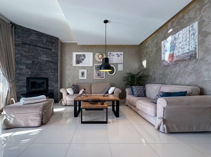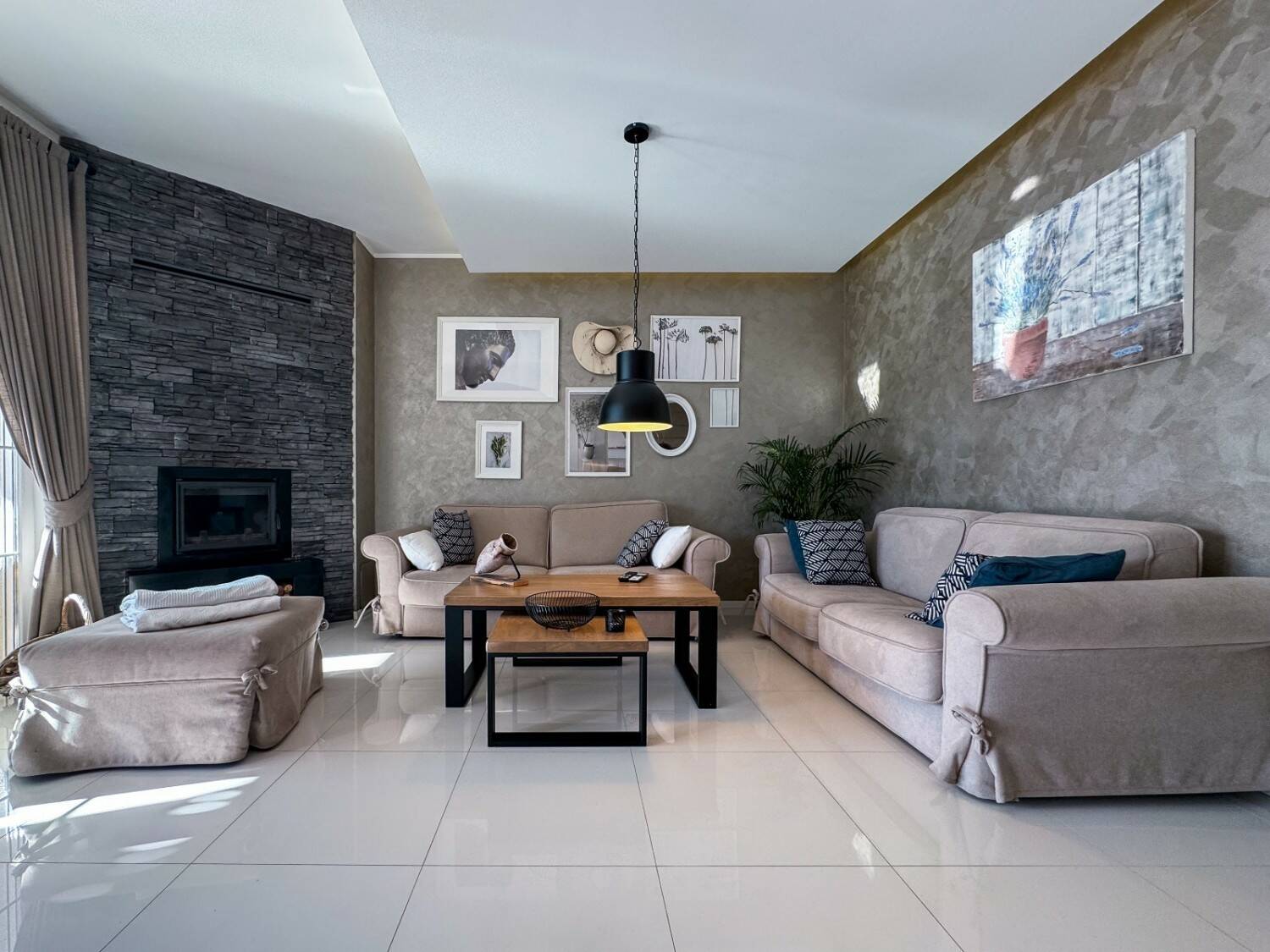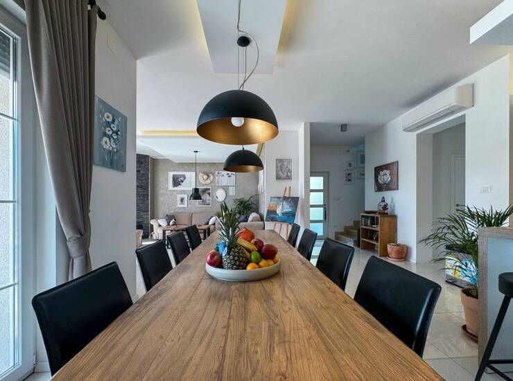 Unutarnji prostor obuhvaća 4 prostrane spavaće sobe i 4 moderno uređene kupaonice, dok otvoreni dnevni boravak s kuhinjom i blagovaonicom odiše svjetlošću i toplinom. Kroz velike staklene stijene interijer se prirodno povezuje s vanjskim prostorom, stvarajući savršen spoj unutarnjeg i vanjskog života.