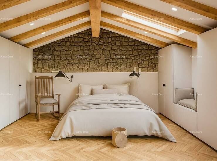 Namještaj izrađen po mjeri (kuhinja, spavaće sobe, kupaonice) naglašava autentičan istarski karakter doma.