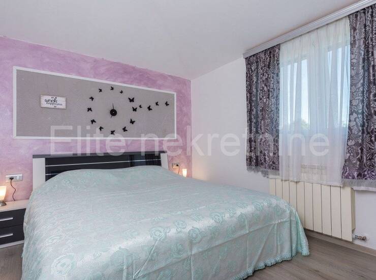Prizemlje kuće još uključuje dvije spavaće sobe sa kupatilima i manji toalet za goste. Unutarnje stepenice vode nas na kat gdje su smještene tri spavaće sobe svaka sa svojim kupatilom i fitness sa nekoliko sprava za vježbanje.
