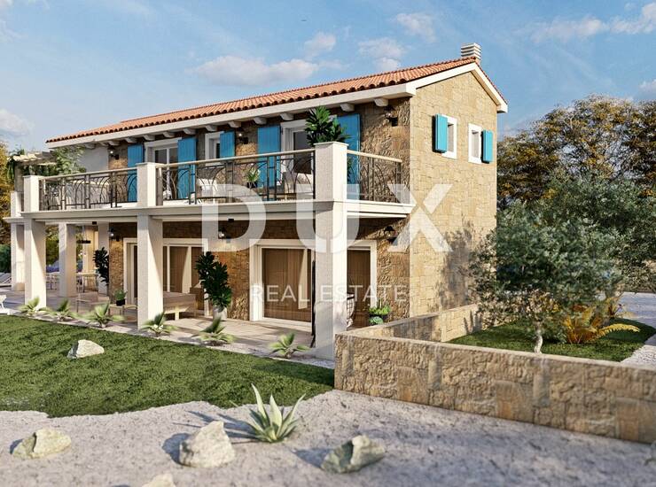 Komforna kuća djelomično obložena kamenom s rustikalnim plavim škurama se oblikovno i koloristički uklopa u naselje i krajolik a proteže se kroz dvije etaže funkcionalnog tlocrta.