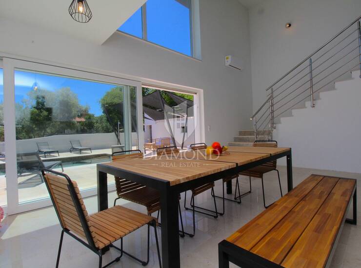 Kuća je koncipirana kao katnica ukupne stambene površine 200 m2. Prizemlje se sastoji od potpuno opremljene kuhinje i blagovaonice sa direktnim izlazom na plažu bazena. Tu se nalaze i tri spavaće sobe sa vlastitim kupaonicama, gostinjski toalet i ostava. Kat objedinjuje komforan dnevni boravak, gostinjski toalet i spavaću sobu sa kupaonicom. Kuća je modernog dizajna kako eksterijera tako i interijera, detalji su minimalistički a naglasak je na otvorenom prostoru sa velikim staklenim stijenama koje osiguravaju prekrasan pogled na more iz svakog kutka ove posebne Ville, ali i dovoljno prirodnog svjetla. U svakoj prostoriji postavljeni su klima uređaji dok je u dnevnom boravku predviđen zatvoreni kamin za dodatan efekt i ugodnost ambijenta. Kuća je građena sa materijalima vrhunske kvalitete a opremljena je funkcionalnim namještajem.