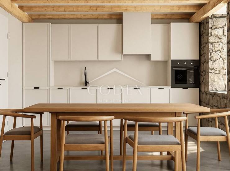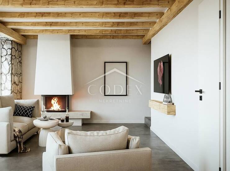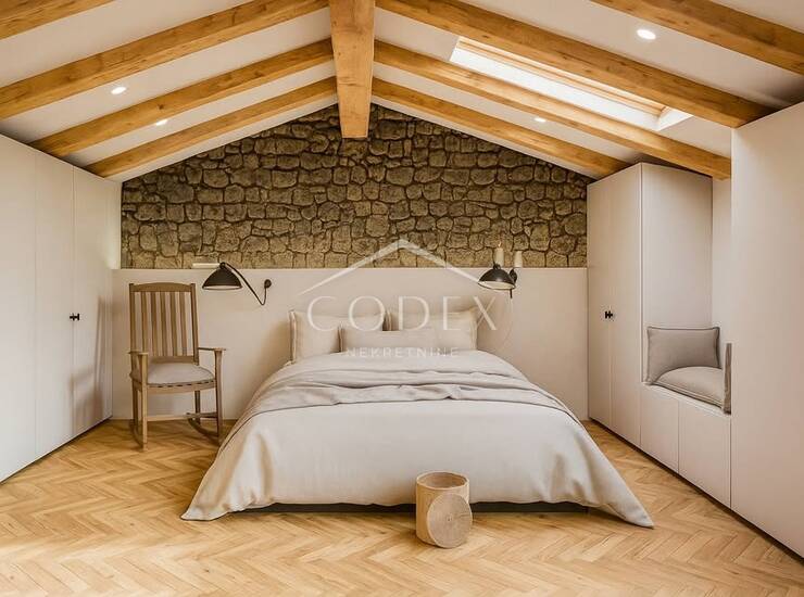 Unutrašnjost kuće uređena je s posebnom pažnjom na detalje. Podovi na katu i kupaonice obloženi su mikrocementom, dok su u spavaćim sobama postavljeni kvalitetni parketi. Sav drveni namještaj izrađen je po mjeri, uključujući kuhinju, spavaće sobe i kupaonice.