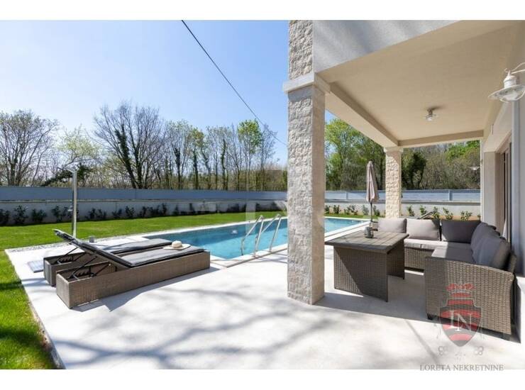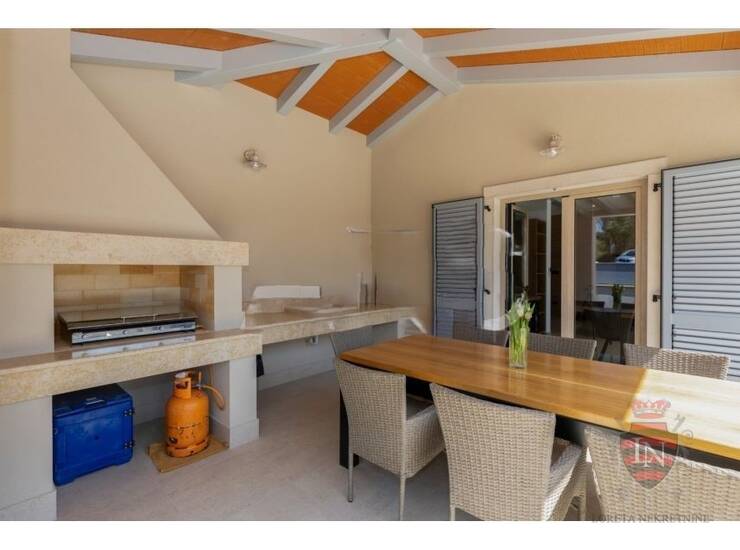 Iz dnevnog boravka pruža se predivan pogled na veliki bazen dimenzija 4 x 10 m, okružen sunčalištem i pažljivo uređenom okućnicom, stvarajući idealan prostor za osvježenje i uživanje tijekom ljetnih mjeseci.