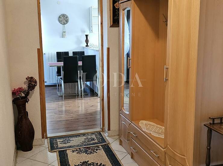 Veći stan sastoji se od natkrivene ulazne terase te ulaznog hola,dvije spavaće sobe,kupatilo,kuhinja i dnevni boravak sa izlazom na terasu.