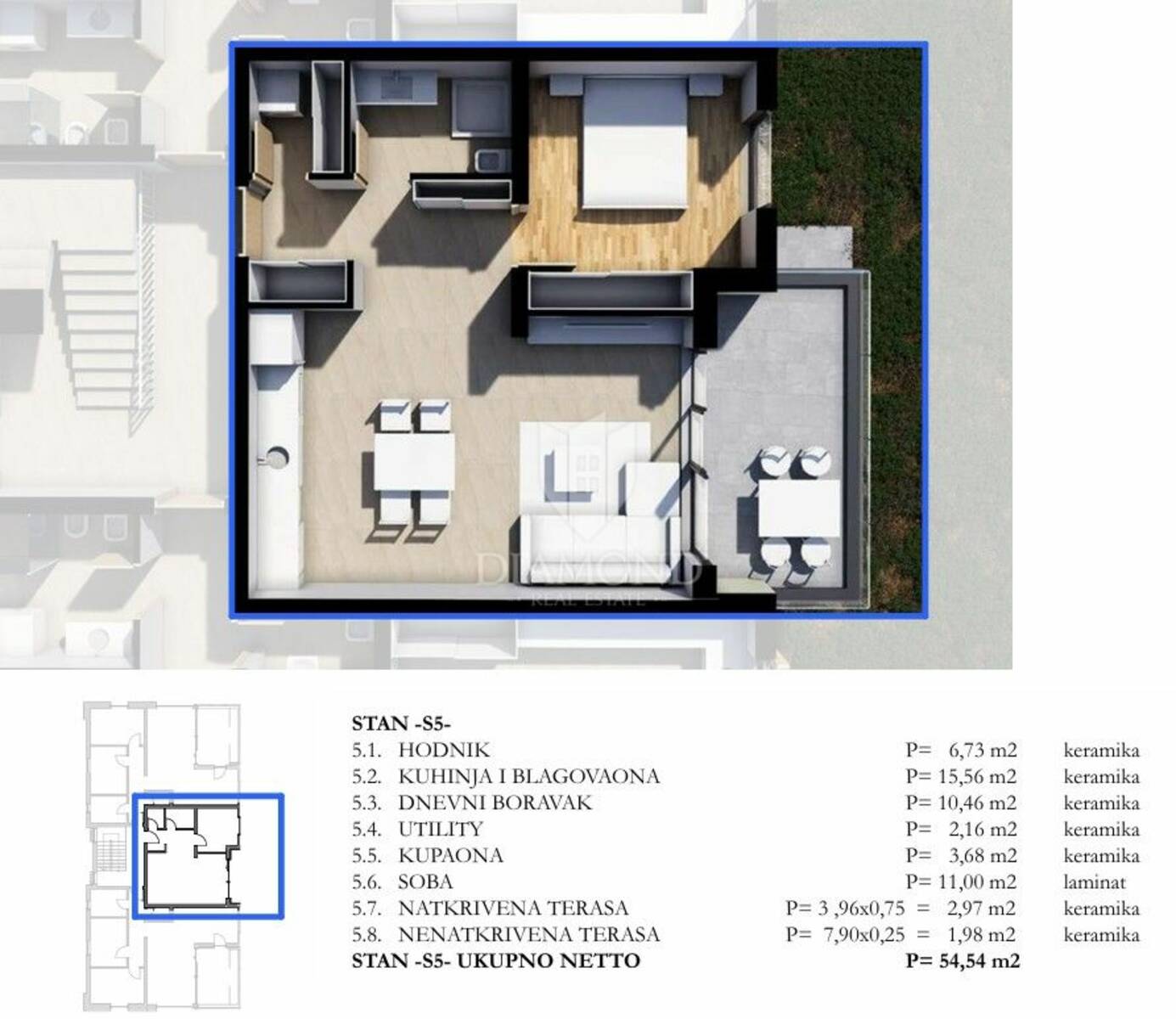 U ponudi je moderni stan u urbanoj vili, smještenoj u mirnom obiteljskom naselju, svega nekoliko minuta hoda od centra grada i svih važnih sadržaja. Ova novogradnja savršen je izbor za sve koji traže mirno okruženje i blizinu gradskog središta.