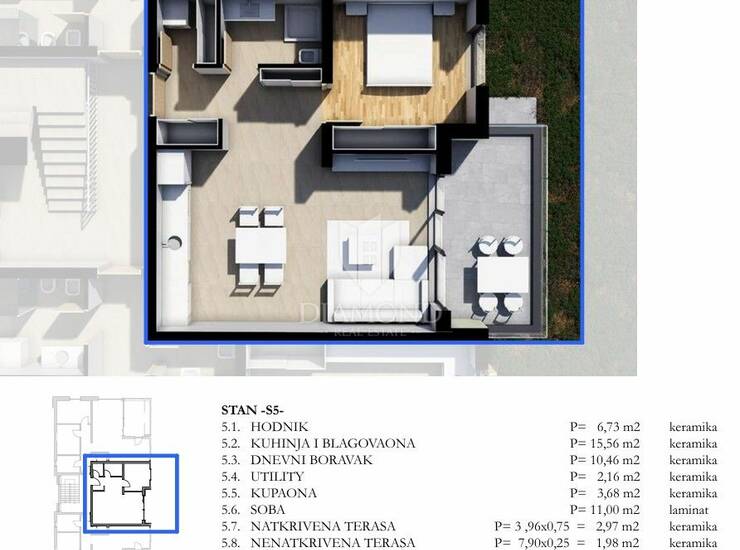 Stan se nalazi na prvom katu i sastoji se od: hodnika, kuhinje s blagovaonicom, dnevnog boravka, spremišta, kupaonice, spavaće sobe, natkrivene i nenatkrivene terase.