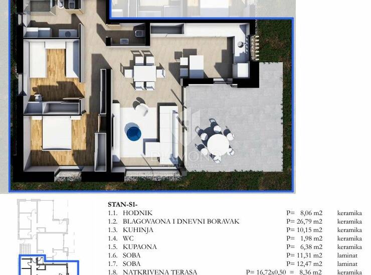 Stan se nalazi u prizemlju te se sastoji od: hodnika, blagovaonice i dnevnog boravka, kuhinje, toaleta, kupaonice, dvije spavaće sobe i natkrivene terase.