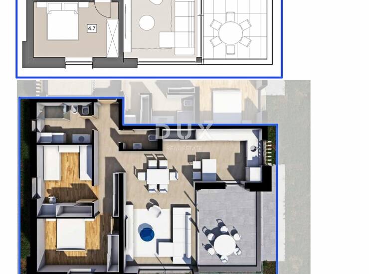 Sastoji se od dvije spavaće sobe, kupaonice, gostinjskog toaleta, hodnika i prostora otvorenog koncepta koji ujedinjuje dnevni boravak, blagovaonicu i kuhinju s izlazom na djelomično natkrivenu terasu.