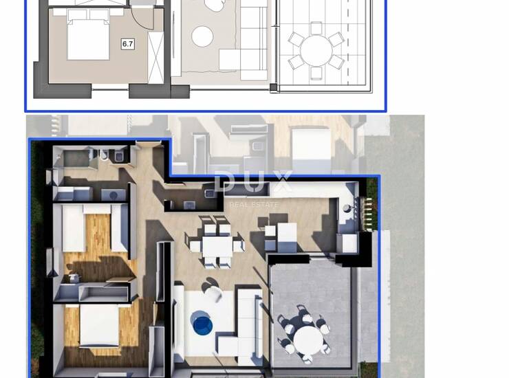 Sastoji se od dvije spavaće sobe, kupaonice, gostinjskog toaleta, hodnika i prostora otvorenog koncepta koji ujedinjuje dnevni boravak, blagovaonicu i kuhinju s izlazom na djelomično natkrivenu terasu.